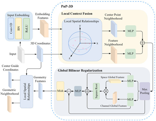 For the output of the input embedding network, PnP-3D is used to model its feature geometric relationship. The embedded feature geometric relationship modeling process is shown in Figure 4. Herein, Conv1D refers to 1D convolution, BN denotes batch normalization, ReLU and Mish are activation functions, and MLP stands for multi-layer perceptron. The inherent 3D geometric information is deeply integrated with the embedded feature , while capturing the shape characteristics of the teeth and the spatial position relationship of a single tooth in the dental model to enhance the expressiveness of the feature. PnP-3D mainly includes two parts: local context fusion and global bilinear regularization. For the original input of the entire encoder, the mesh center point coordinate is , which is first used as the coordinate guide for local context fusion. The input feature is processed by the input embedding network as the embedded feature to enhance the abstractness and expressiveness of the original feature, which helps PnP-3D to learn the geometric structure of the dental mesh data. The entire PnP-3D processing process is recorded as , and the geometric perception feature can be obtained as follows: