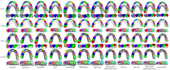 In contrast, the proposed MECSegNet is closest to the ground truth under full supervision, and it can still effectively identify wisdom tooth data with only 20% labeled data. Compared with the methods in [26,29], the number of mis-segmentations is very small, which demonstrates the effectiveness of the self-supervised dental model segmentation algorithm.