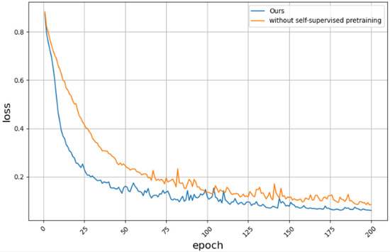 The supervised fine-tuning network with only 20% labeled data was compared with the original self-supervised complete algorithm by ablation, and the convergence comparison of the training loss is shown in Figure 8. Compared with the network without self-supervision, the proposed method converges faster and has a lower final loss value.