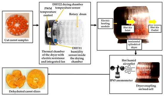 The drying chamber is equipped with electric resistance, located at the bottom of the system, to supply heat through forced convection. Heating intensity is regulated by a pulse-width modulator (RobotDyn, Zhuhai, China), which ensures precise temperature control within a range of 50 °C to 75 °C, depending on the food type and specific process requirements. Hot air generation and circulation are provided by a centrifugal fan with a nominal (maximum design) power rating of 200 W, enabling efficient heat transfer while minimizing turbulence. The cylindrical drum used for carrot dehydration is arranged horizontally to guarantee mechanical stability, uniform rotation, and a controlled product residence time. In addition, the system incorporates internal flights that lift and disperse the product during rotation, promoting better mixing and enhancing both heat and mass transfer efficiency. The recorded temperature in the rotary dryer corresponds to the drying air inside the drum, accurately representing the thermal environment to which the carrot samples are exposed during dehydration.