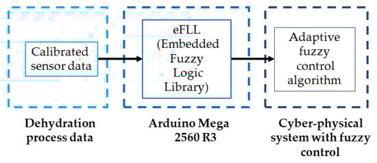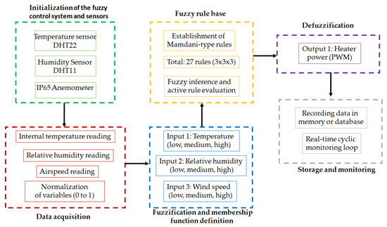 To optimize the dehydration process through intelligent control, a fuzzy control system based on Mamdani logic was implemented on the Arduino Mega 2560 R3 platform. The controller receives real-time measurements from temperature, humidity, and airflow velocity sensors to dynamically regulate the power supplied to the heating element, ensuring uniform drying and stable thermal conditions, as shown in Figure 3 [36].