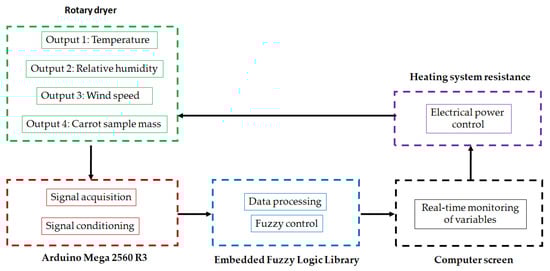 The control architecture was based on the Arduino Mega 2560 R3 open-hardware platform, selected for its compatibility with multiple sensors and its capacity to handle real-time applications. Process control was implemented through a fuzzy logic algorithm programmed in C++ using a specialized artificial intelligence library. The developed system integrates multivariable monitoring of temperature, relative humidity, air velocity, and product mass loss, enabling dynamic control of drying conditions and optimizing both dehydration time and energy efficiency. Through fuzzy control based on experimental rules tailored to the specific dehydration kinetics of carrots, the system responds precisely to variations in critical process variables. The combination of multivariable sensors, real-time data acquisition, and fuzzy logic applied to a rotary dryer with mass control minimizes residual moisture zones and reduces energy consumption per kilogram of product [33,34,35].
