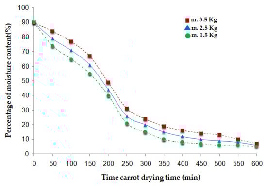 At the beginning of each experimental trial, the internal temperature of the rotary dryer was stabilized to ensure consistent drying conditions. Pre-weighed carrot samples were evenly distributed within the dryer, and their mass was continuously monitored using load cells. The progressive loss of moisture was recorded throughout the drying process, and the moisture content of the samples was calculated using Equation (6). This approach allowed precise determination of the percentage of moisture remaining in the samples, enabling the construction of accurate drying curves for each tested load and facilitating the analysis of dehydration kinetics under controlled experimental conditions.