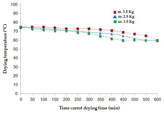 In tests with different initial carrot masses, the average operating temperature was 75 °C, decreasing to around 65 °C at the product’s drying point and stabilizing near 60 °C at the end of the process, as shown in Figure 7. This temperature distribution aligns with thermal analyses reported for convective flow dryers [35], confirming that the system design and fuzzy control maintain an adequate thermal gradient for efficient heat transfer without damaging product structure.