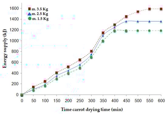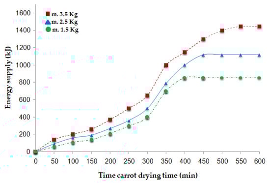 The Arduino system integrated the energy consumption over time, enabling a precise estimation of the total electrical energy supplied. The electrical energy supplied during the drying process and evaluated by Arduino was 1445 kJ (3.5 kg), 1119 kJ (2.5 kg), and 855 kJ (1.5 kg) for their respective cases. These results are clearly illustrated in Figure 9, allowing for a more detailed understanding of the contribution of electrical energy to the overall energy balance of the drying system.