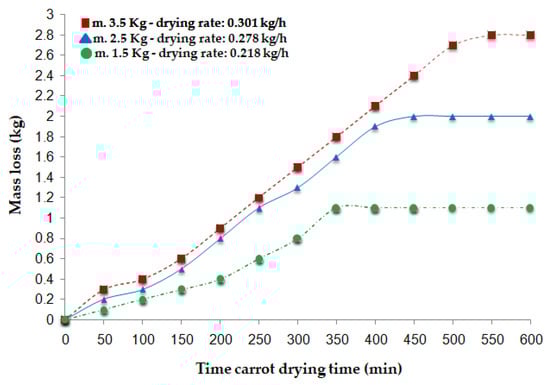 Experimental results indicated that the 1.5 kg load exhibited an average dehydration rate of 0.218 kg/h, the 2.5 kg load reached 0.278 kg/h, and the 3.5 kg load achieved 0.301 kg/h, as shown in Figure 10. These results reflect an increasing trend in the drying rate with larger loads, attributable to higher water content and efficient regulation of the dryer’s internal temperature. However, although the 3.5 kg load presented the highest drying rate, its energy consumption also increased, highlighting the need to balance efficiency, energy use, and drying speed. Accurate measurement of this variable is crucial for establishing control strategies that optimize process operating conditions [30,33,53].