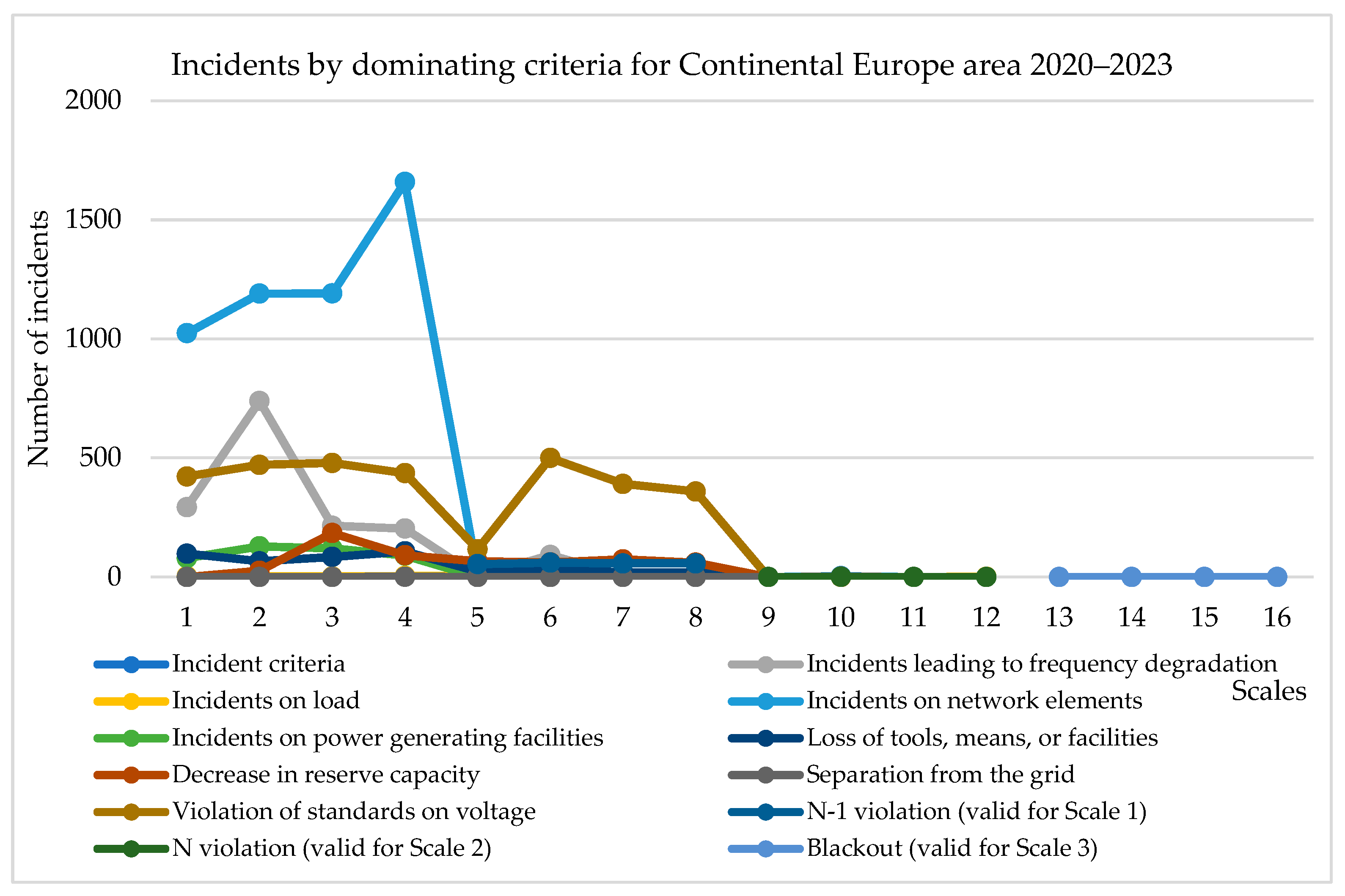 Table 1 summarizes incidents recorded in Continental Europe between 2020 and 2023 according to dominant technical criteria and severity levels. Only significant events are reported and classified using a severity-based scale: Scale 0 for significant local events; Scale 1 for major events involving operational security limit violations; Scale 2 for large-scale events with the potential for wide-area impacts; and Scale 3 for severe events occurring within a single control area.