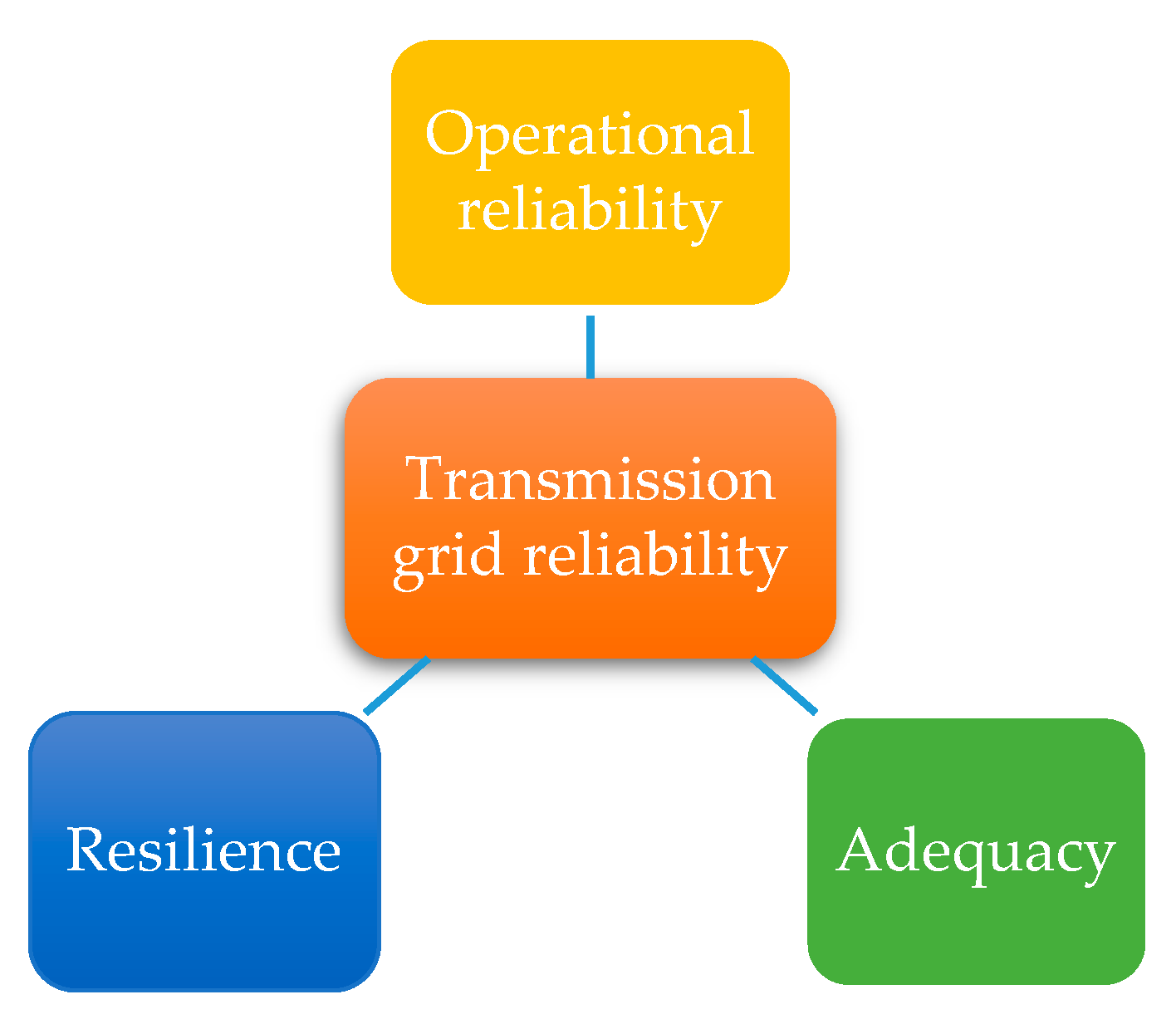 Figure 2. Resource adequacy ensures that sufficient generation capacity is available to meet demand. Operational reliability focuses on the grid’s ability to withstand component outages and prevent cascading failures. Resilience, which has gained increasing attention in recent years, describes the grid’s capability to endure extreme events and recover rapidly following major disruptions.
