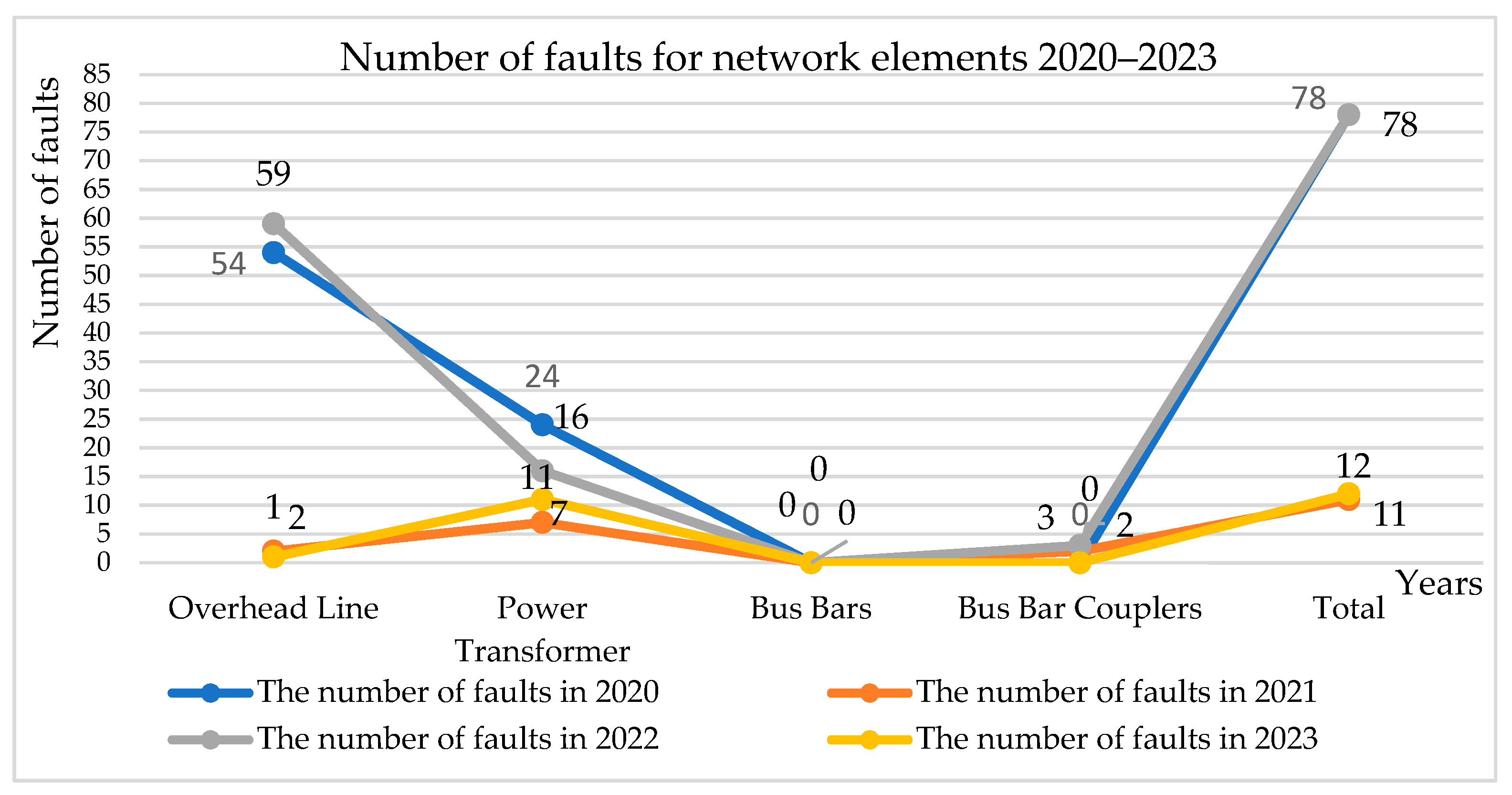 Table 2, the highest number of failures related to overhead transmission lines occurred in 2022, with a total of 59 recorded events. Power transformer failures were most frequent in 2020, with 24 recorded incidents. No failures were reported for bus bars during the investigated period, while bus bar coupler failures occurred only in 2021 and 2022. The zero values indicate years in which no failures were recorded for the corresponding components.