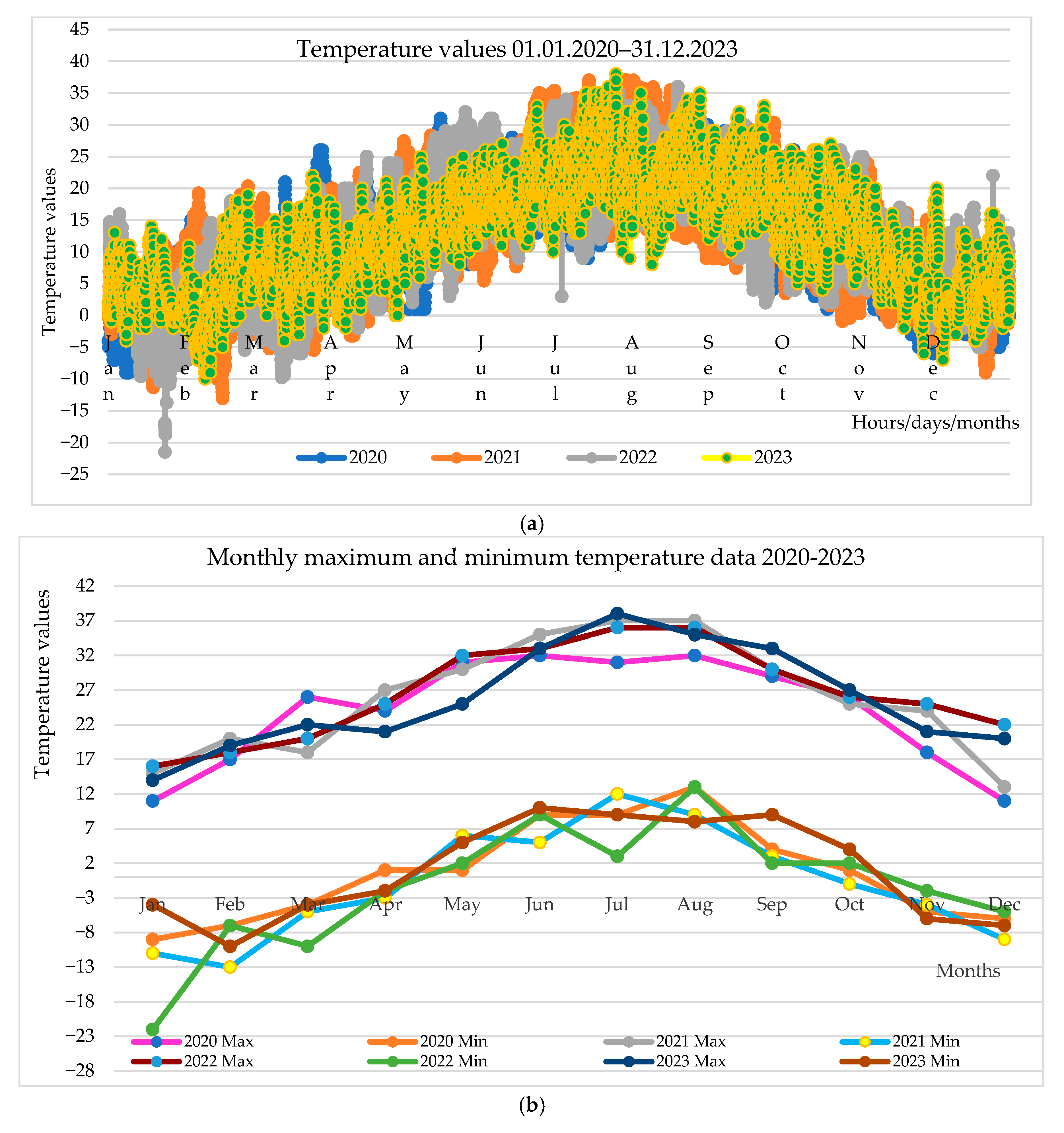 Figure 5 presents the meteorological temperature data recorded during the period of 1 January 2020 to 31 December 2023, including hourly temperature values and the corresponding monthly maximum and minimum temperatures.