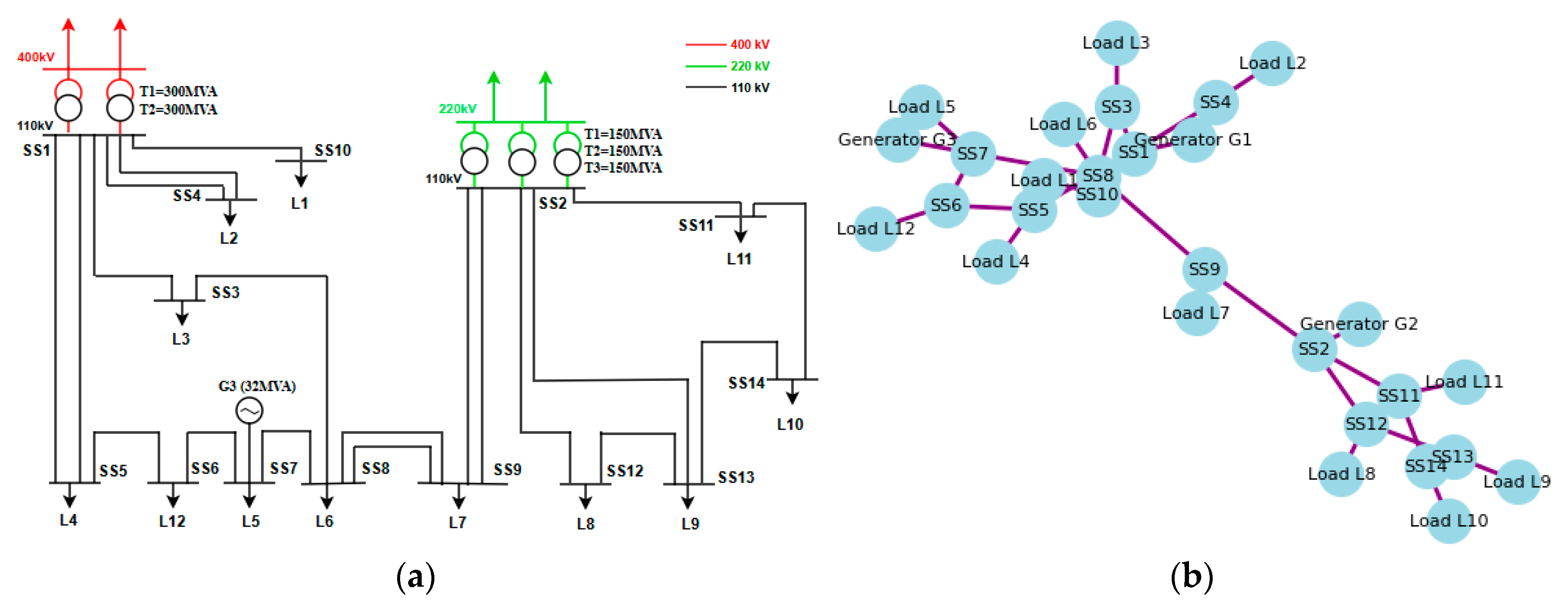 Figure 7 illustrates the system under study and its corresponding undirected graph representation. The system consists of a 14-bus transmission network, including substations, transmission lines, generators, and load points, and forms an integral part of the Kosovo power transmission system. The aggregated demand of the analyzed network segment is 310 MW and 41 MVar.