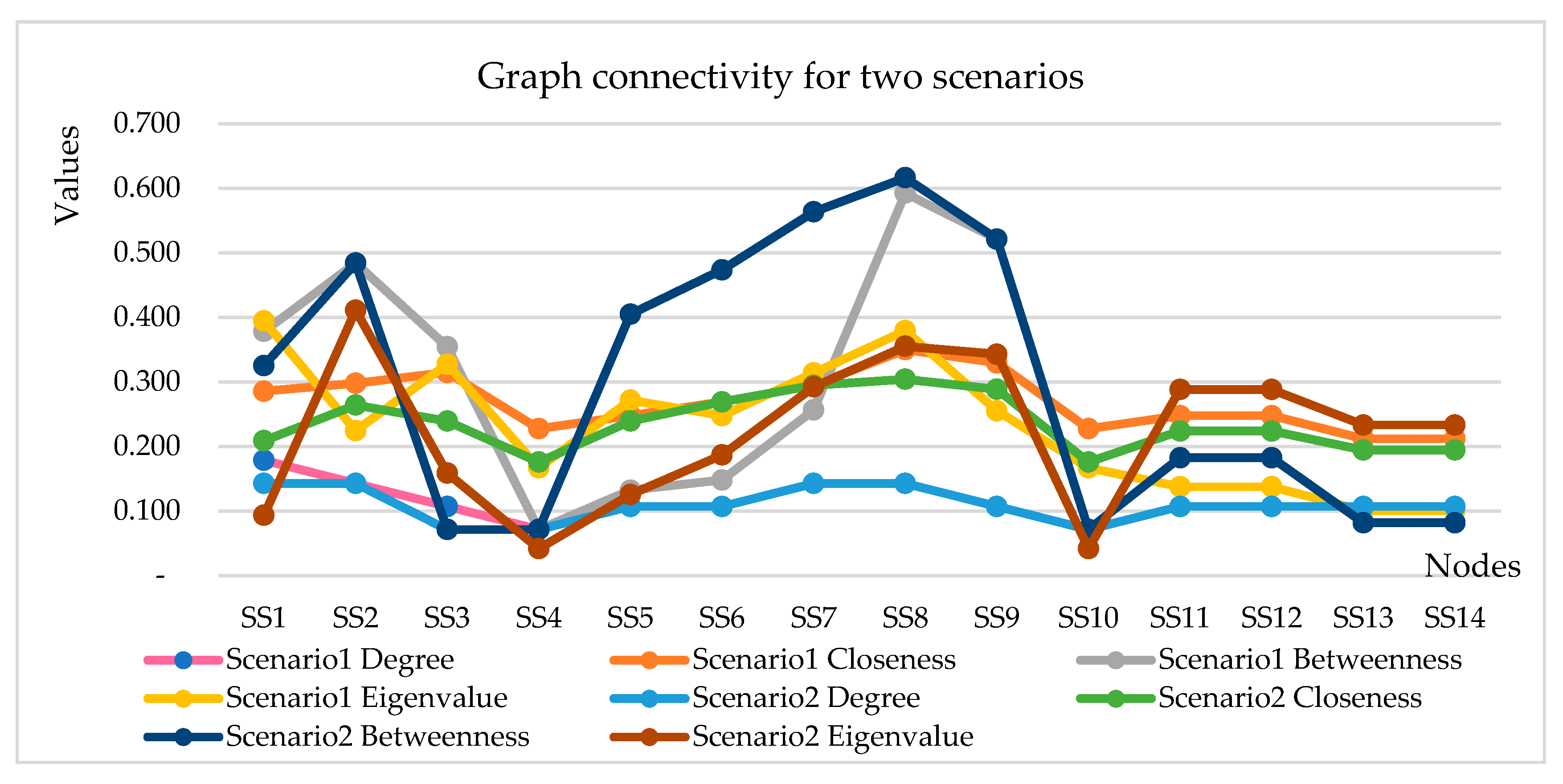 Eigenvector centrality reflects not only the importance of a node but also the importance of its neighboring nodes. Higher eigenvector centrality values indicate nodes that are connected to other influential nodes within the network. For the analyzed system, the highest eigenvector centrality values are associated with substations SS8 and SS9 in the first scenario and with SS8 and SS7 in the second scenario.