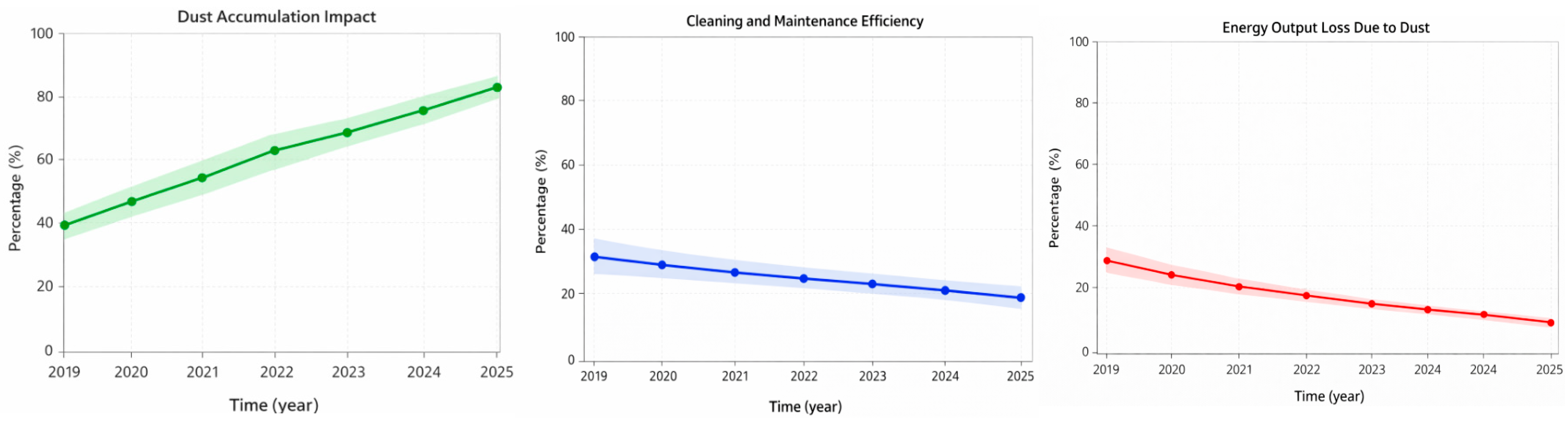 | [59] (2020) | Iran | A study examining the effects of dust on solar system efficiency across different tilt angles in a semi-arid climate. | Dust accumulation resulted in an 8.6% average daily energy reduction for horizontal modules and a 0.8% reduction for tilted modules. |