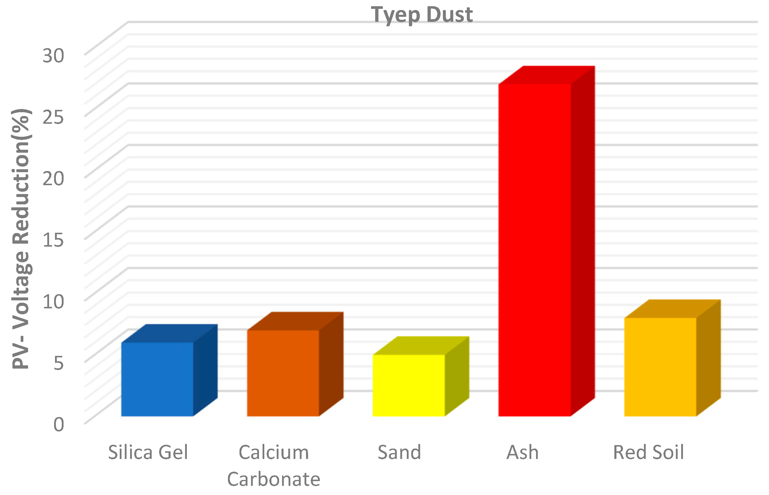 | [119] (2017) | Egypt, Beni-Suef 10 wat (Experimental cells) | Without cleaning | Natural dust | To conduct a practical case study to assess the impact of natural dust deposition on the photovoltaic-electrical process on the East Bank of the Nile region. | Dusty solar arrays had lower power output, voltage, current, and output, the study found. It was found that the dirty panel produced approximately 50% less power than the reference panel. These findings demonstrate the importance of regular cleaning to maintain PV systems’ peak performance and energy output. |