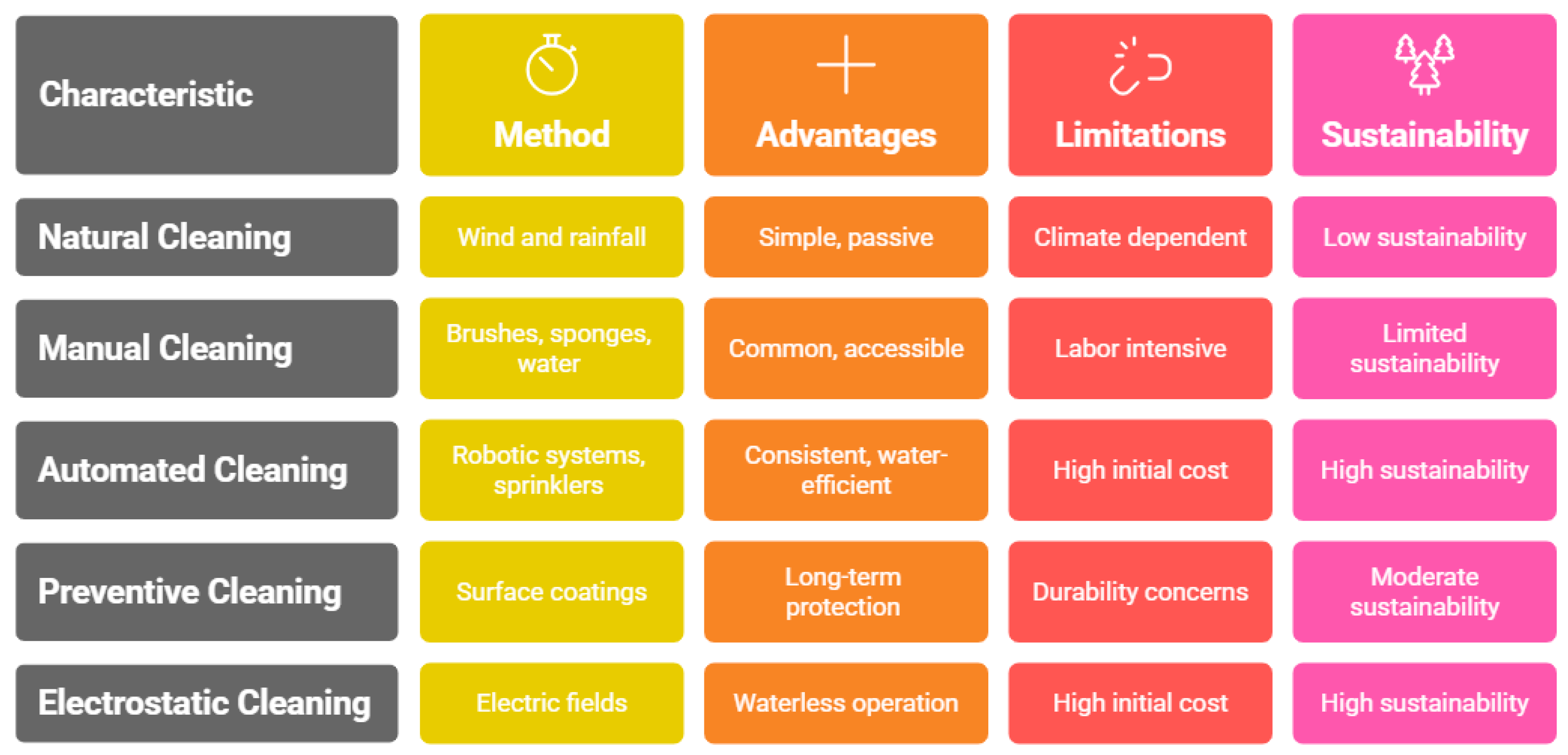 - To evaluate current cleaning and mitigation techniques, including hydrophobic coatings, robotic systems, and manual methods, assessing their efficiency, cost, and applicability.