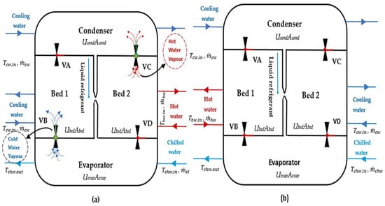 This study considers a single-stage, dual-bed silica-gel and water adsorption chiller that uses low-grade hot water as its energy source. Each bed alternates between adsorption and desorption depending on the pressure variations and the opening and closing of the valves. The system consists of an evaporator that cools the chilled water loop and a condenser to dissipate heat to the cooling water loop. Figure 1 shows the main components and flow paths, with a summary of the operating cycle. The evaporator and condenser connect to the adsorbent bed via four switching valves (V1–V4).