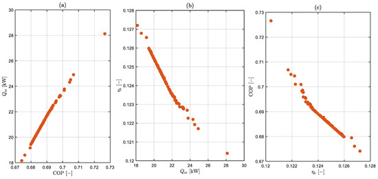 From the regression analysis equations of the selected variables (Equations (2), (4) and (6)), the adjusted R2 values of 0.8041 for COP, 0.9250 for , and 0.8371 for indicate that the chosen equations offer a good fit for the data. The high values of adjusted R2 across all three objective functions (COP, and ) validate the suitability of the selected equations for modelling the relationships between the variables.