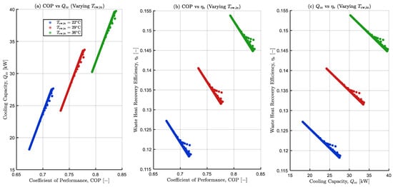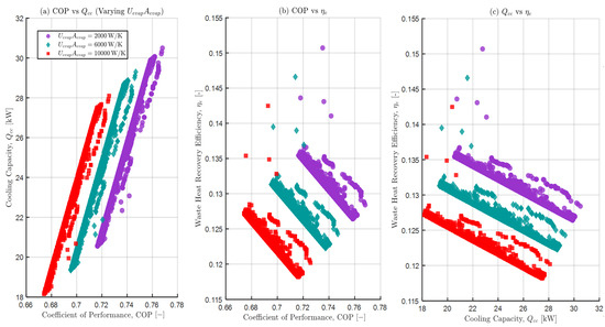 This study introduces as a co-equal objective alongside COP and Qcc rather than a derived metric. As a co-equal to COP and , is used consistently through modelling, single and multi-objective optimisation, plotting, validation with external literature and design guidance. This is to explicitly inform design source utilisation choices and quantify how low-grade heat can be effectively converted to useful cooling. In this way, waste heat recovery efficiency is treated as a core design target as opposed to a secondary indicator.