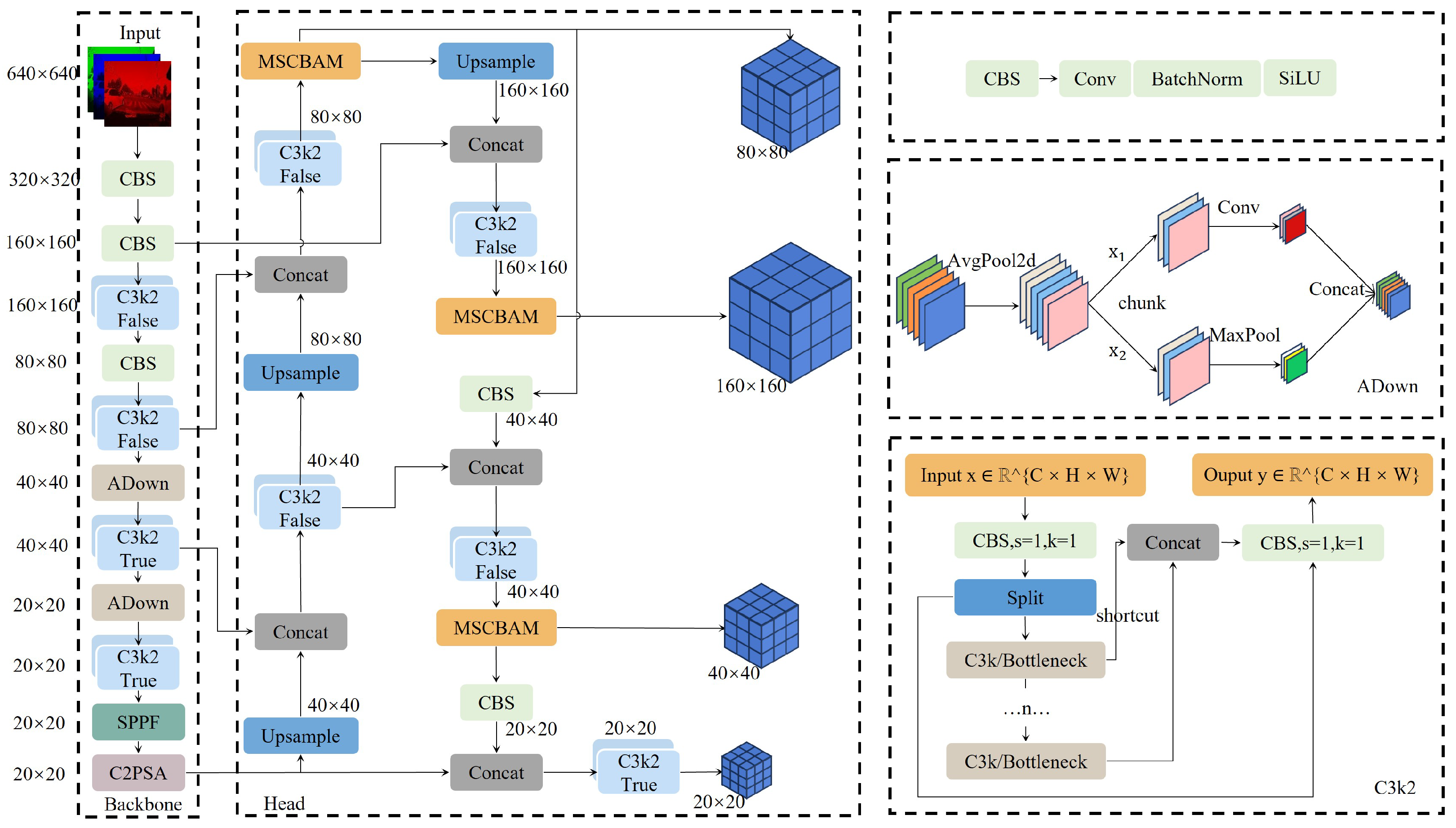 Figure 1, the conventional convolutional modules in the P4 and P5 layers of the YOLO11n backbone are replaced with Adaptive Downsampling (ADown) modules to enhance the network’s lightweight design. A micro-detection head is incorporated at the output end, introducing a high-resolution feature layer to improve the detection accuracy of tiny objects and a Multi-Scale Convolutional Block Attention Module is proposed and applied to the medium, small, and micro-detection heads to enhance detection accuracy.
