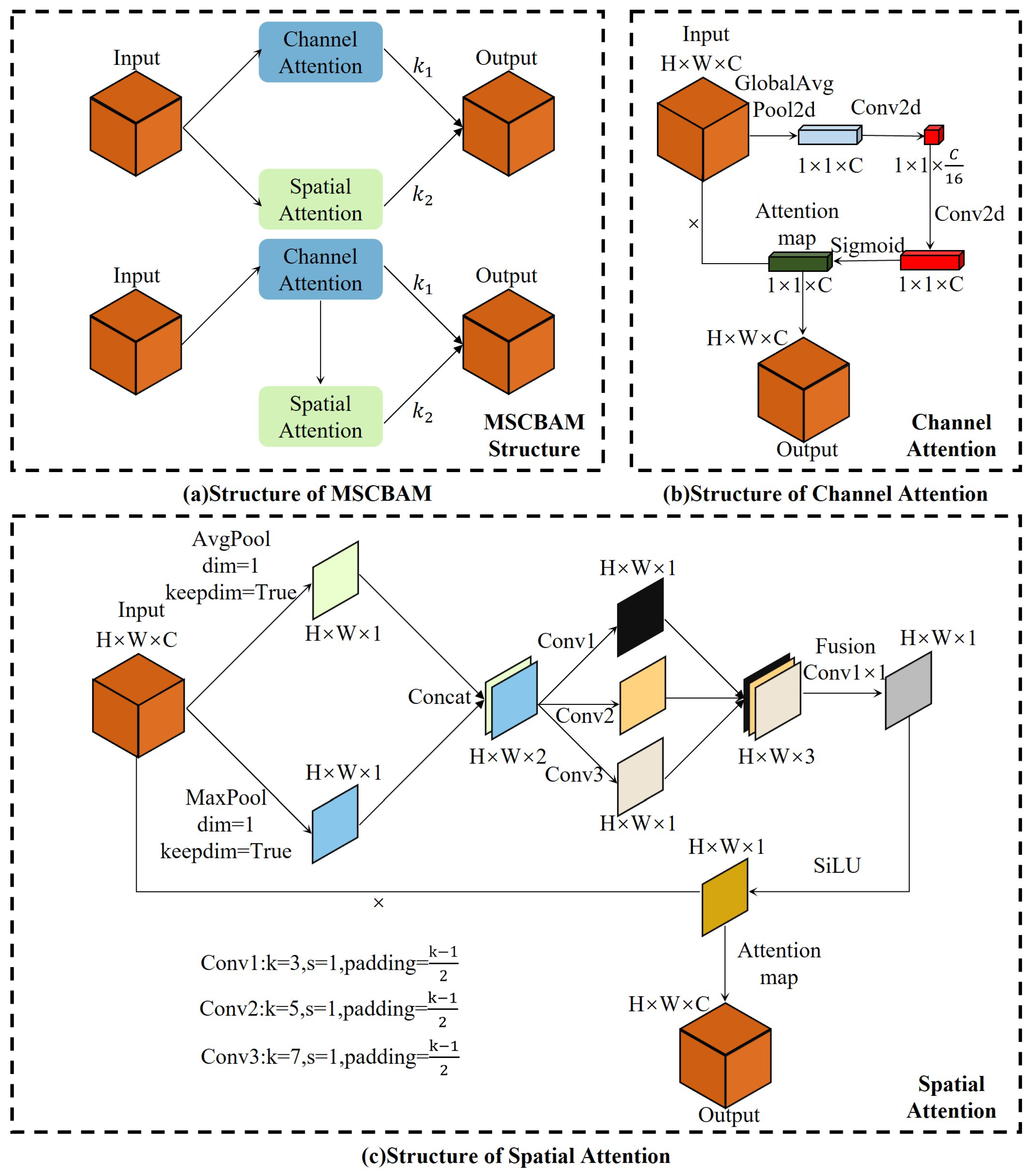Figure 3c, the SA module first enhances the model’s ability to perceive salient regions and global distribution by applying average pooling and max pooling across the channel dimension. The resulting two spatial feature maps are concatenated and passed through a multi-scale convolutional module with kernels of sizes 3 × 3, 5 × 5, and 7 × 7 to capture spatial features at different scales. A 1 × 1 convolution is then used to fuse these multi-scale features, followed by the application of a SiLU activation function, which highlights critical regions while suppressing less informative ones, thereby improving the model’s representational power. The corresponding formulations are given below: