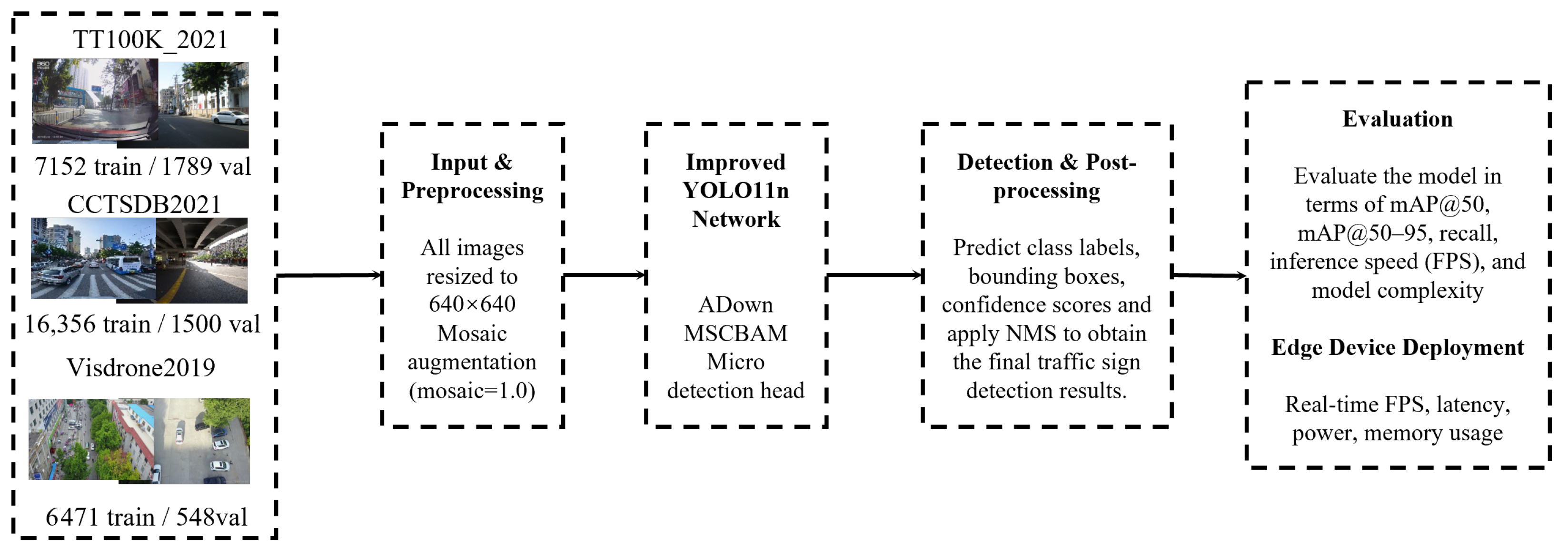 Figure 4. First, all images from the TT100K_2021 and CCTSDB2021 datasets are resized to 640 × 640 and augmented using Mosaic. The processed images are then fed into the improved YOLO11n network, which integrates the ADown module, the MSCBAM attention mechanism, and a micro-detection head. After prediction, non-maximum suppression (NMS) is applied to obtain the final traffic sign detection results. Finally, the performance is evaluated in terms of mAP@50, mAP@50–95, recall, inference speed (FPS), and model complexity.