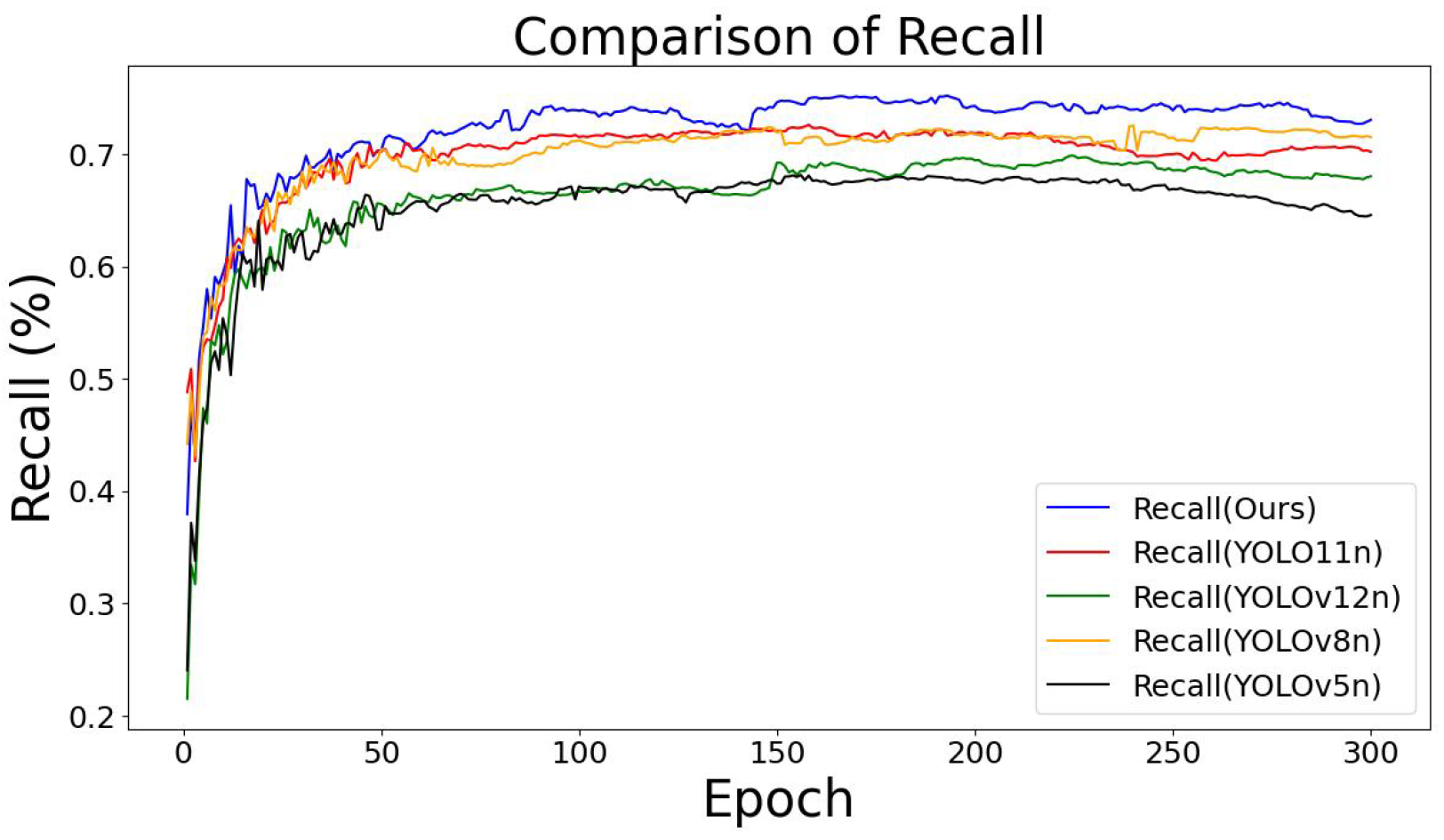 Comparison of recall between the improved network and the original YOLO models.