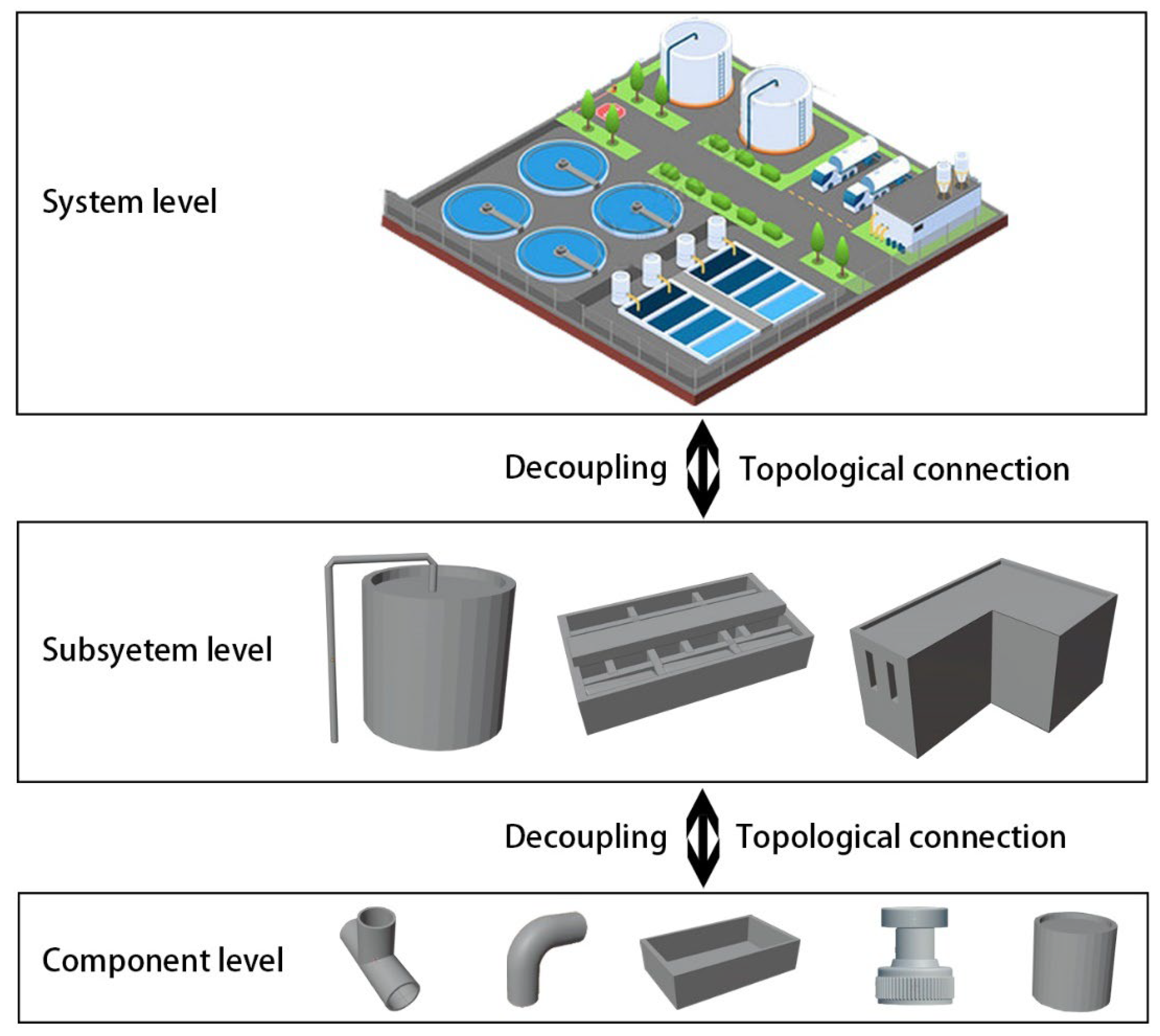 A three-level hierarchical architecture of system–subsystem–component levels was constructed. Through stepwise refinement, cross-scale, highly coupled complex systems are transformed into multiple independently implementable simple Digital Twin components, whereas the integration and coordination of multilevel Digital Twins are achieved via unified interface specifications and information set models.