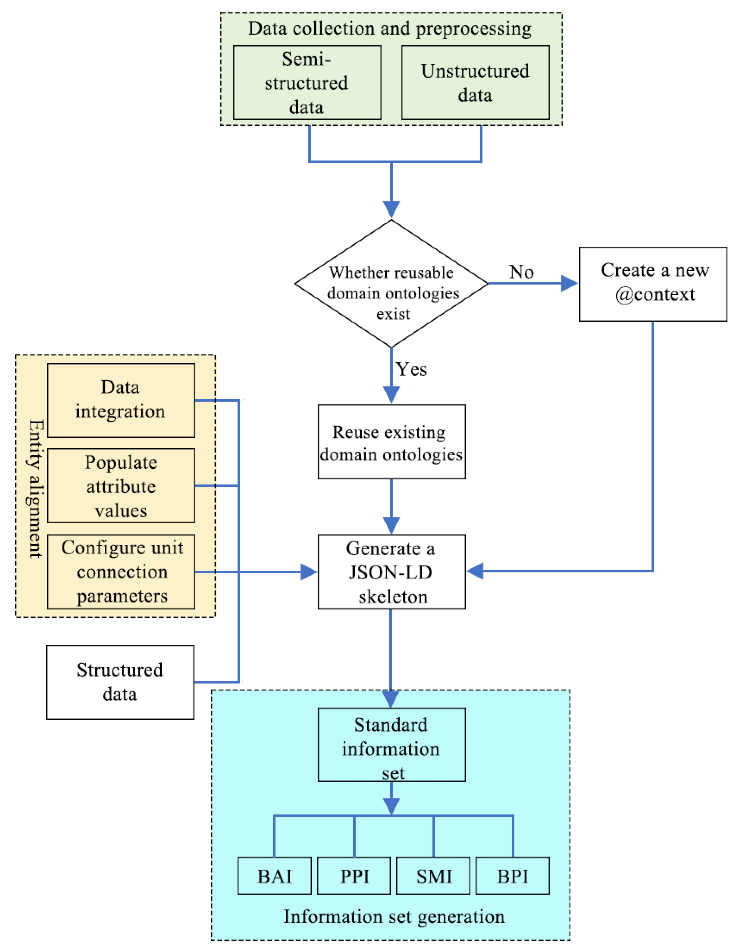 Figure 4. First, the semi-structured and non-semi-structured data generated during the design, manufacturing, and operation phases are uniformly collected and preprocessed to form a heterogeneous raw dataset. Branch processing is then performed based on “whether reusable domain ontologies exist.” If available, the existing domain ontologies are reused; otherwise, new domain vocabularies must be constructed. Next, a JSON-LD skeleton is generated, and the structured data are mapped to four core information categories (basic attributes, physical parameters, structural materials, and business parameters) using entity alignment and attribute value population techniques to complete semantic encapsulation. Finally, all concepts and relationships are integrated to form a structured information set that comprehensively describes the characteristics of physical entities.