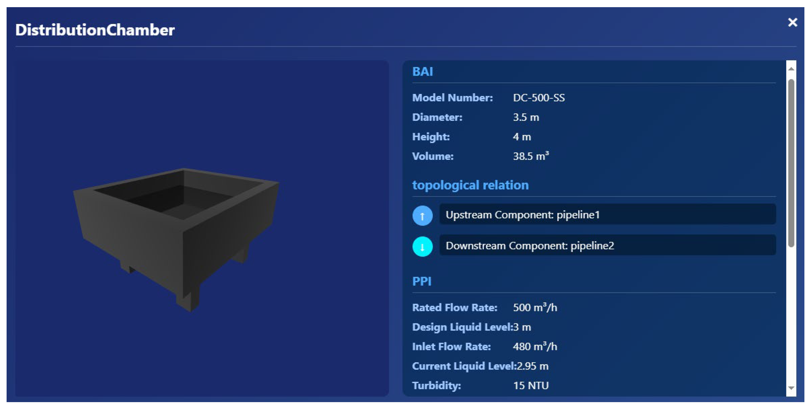 Appendix A). In basicAttributes, the ID field defines metadata, such as equipment name, model, and version. The G field describes the component’s geometric form, including diameter, height, and volume. The TD field specifies the component’s position in the topology and identifies the upstream and downstream connections. In physicalParameters, the S field specifies the design operating conditions. The D field represents the component’s real-time operational status, including dynamic sensor data such as inlet/outlet flow rates, water level, and turbidity. structuralMaterial defines information such as the component’s material, density, and corrosion resistance grade. businessParameters define the operational parameter logic, enabling digital management throughout the entire lifecycle.