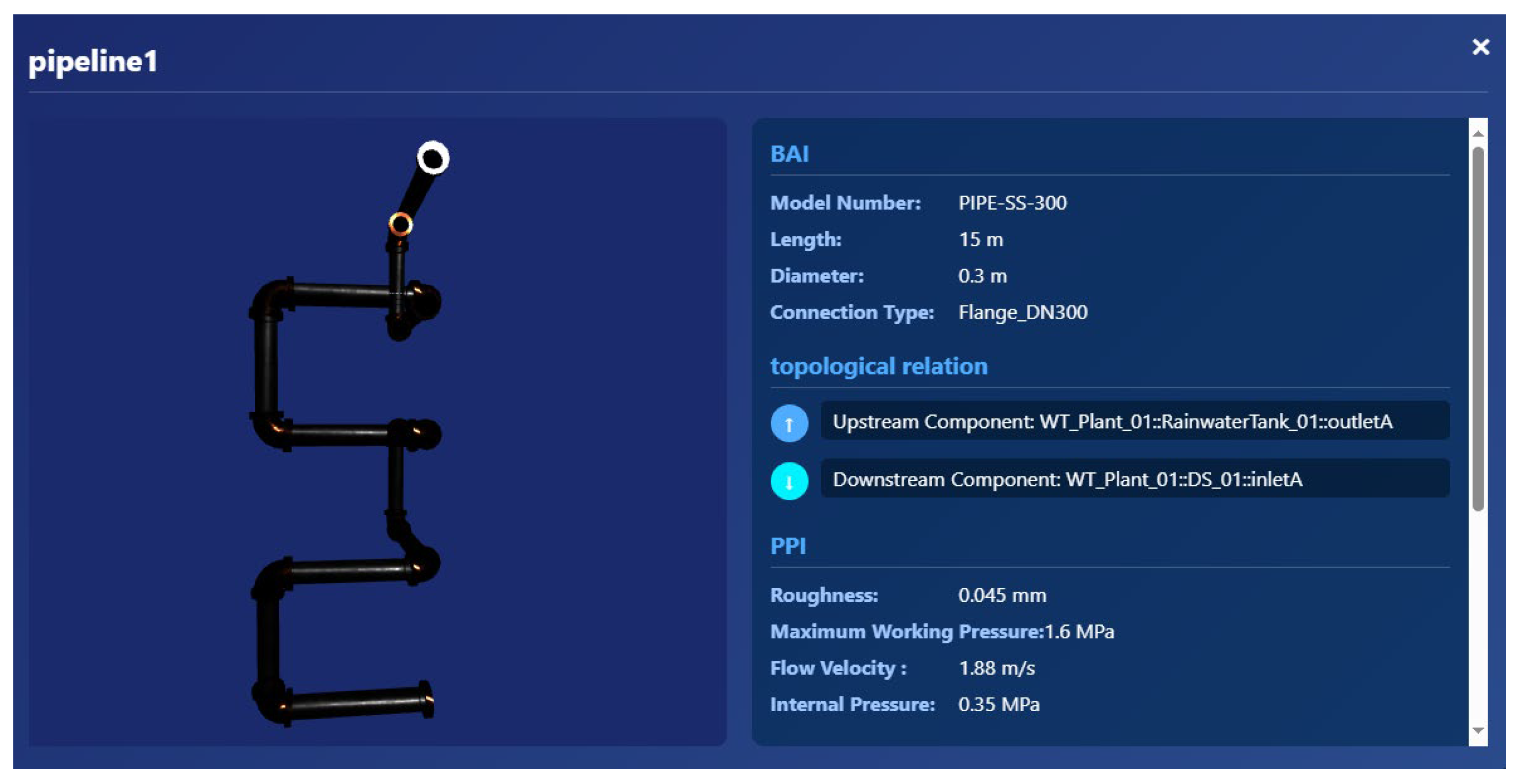 The core reusability of this method lies in the independence and completeness of the component-level Digital Twins. Pipeline 1, constructed in the aforementioned example, encapsulates the basic attribute information, physical parameter information, structural material information, and business parameter information of the component. Constructing a new pipeline only requires updating of the corresponding fields of Pipeline 1: except for the modification of the main parameters such as pipeline length, inner diameter, and shape, most of the other attributes such as material MAT, manufacturing process MFG, and interface type TC.connectionCompatibility can be directly reused without changes.
