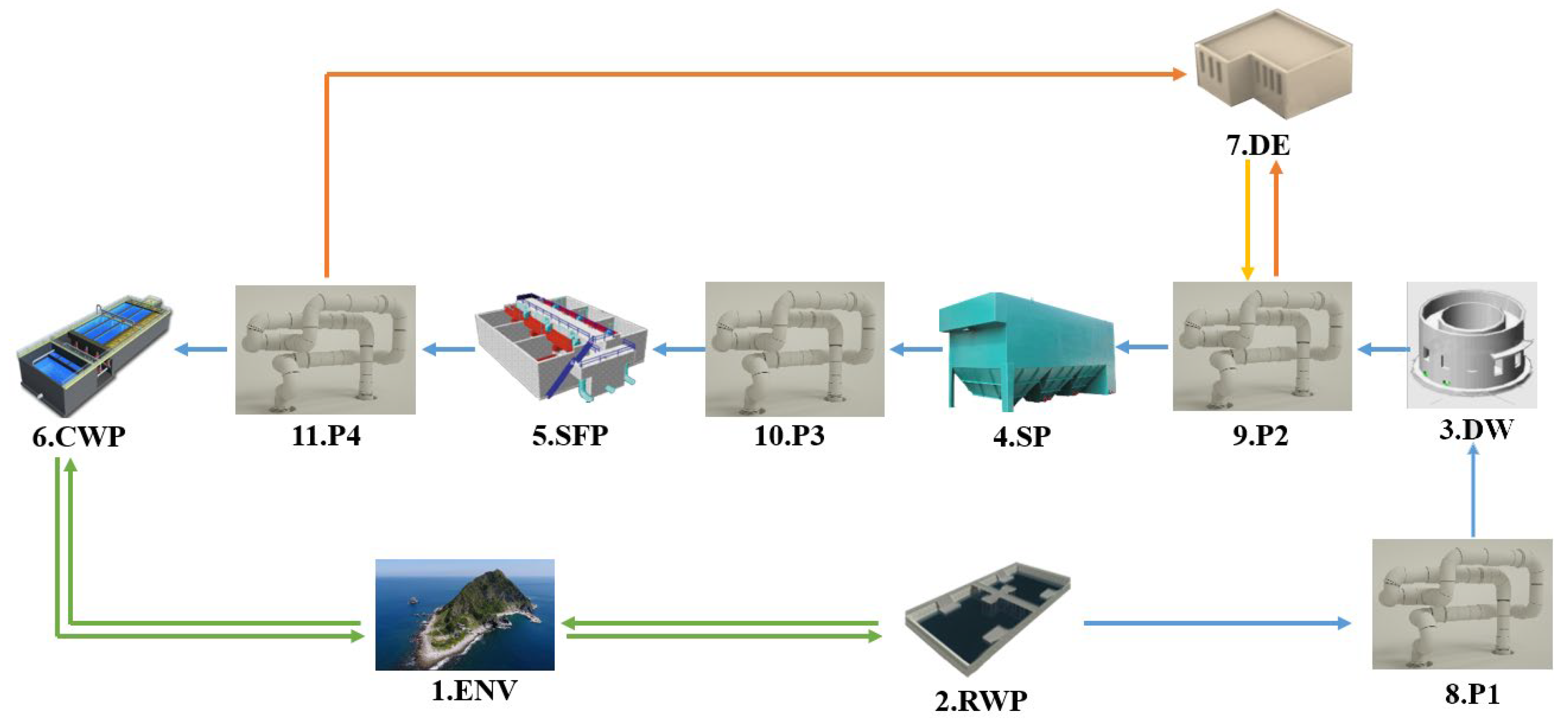 Figure 9. Here, ENV represents the external environment, RWP denotes the rainwater collection pool, DW represents the distribution chamber, SP denotes the sedimentation pool, SFP represents the siphon filter pool, CWP denotes the clear water pool, DE denotes the dosing equipment, P1 indicates pipeline1, P2 indicates pipeline2, P3 represents pipeline3, and P4 represents pipeline4.