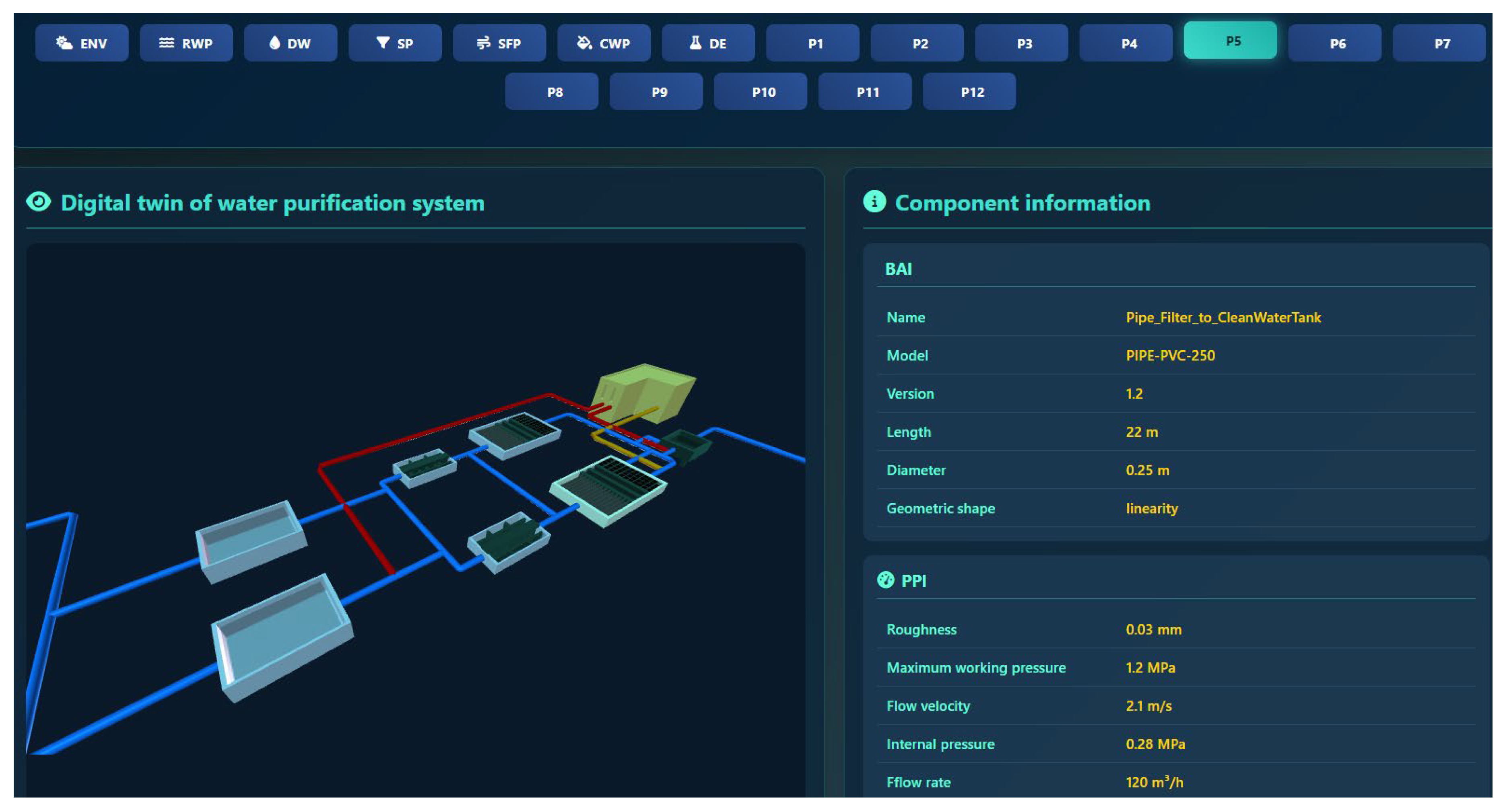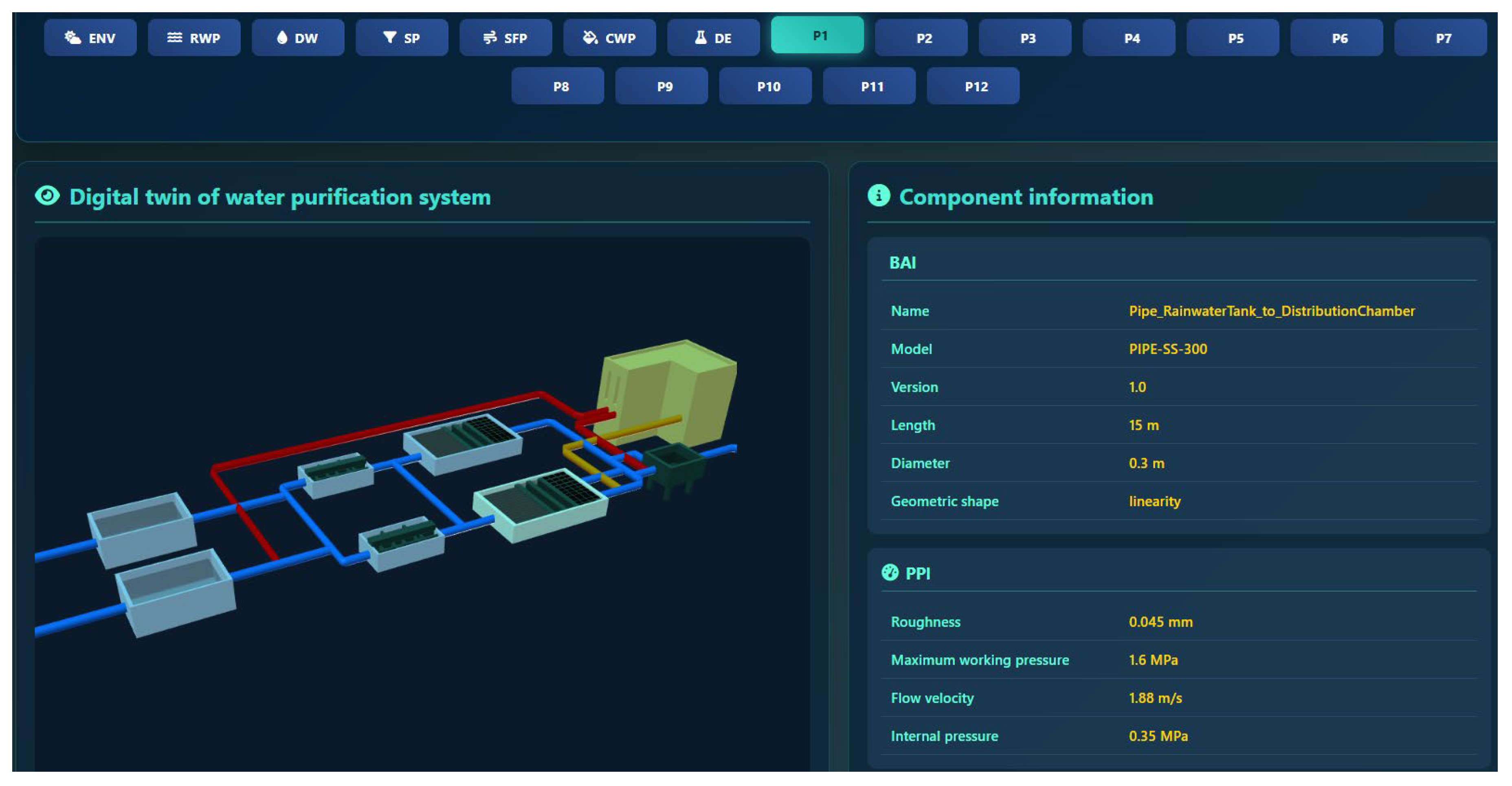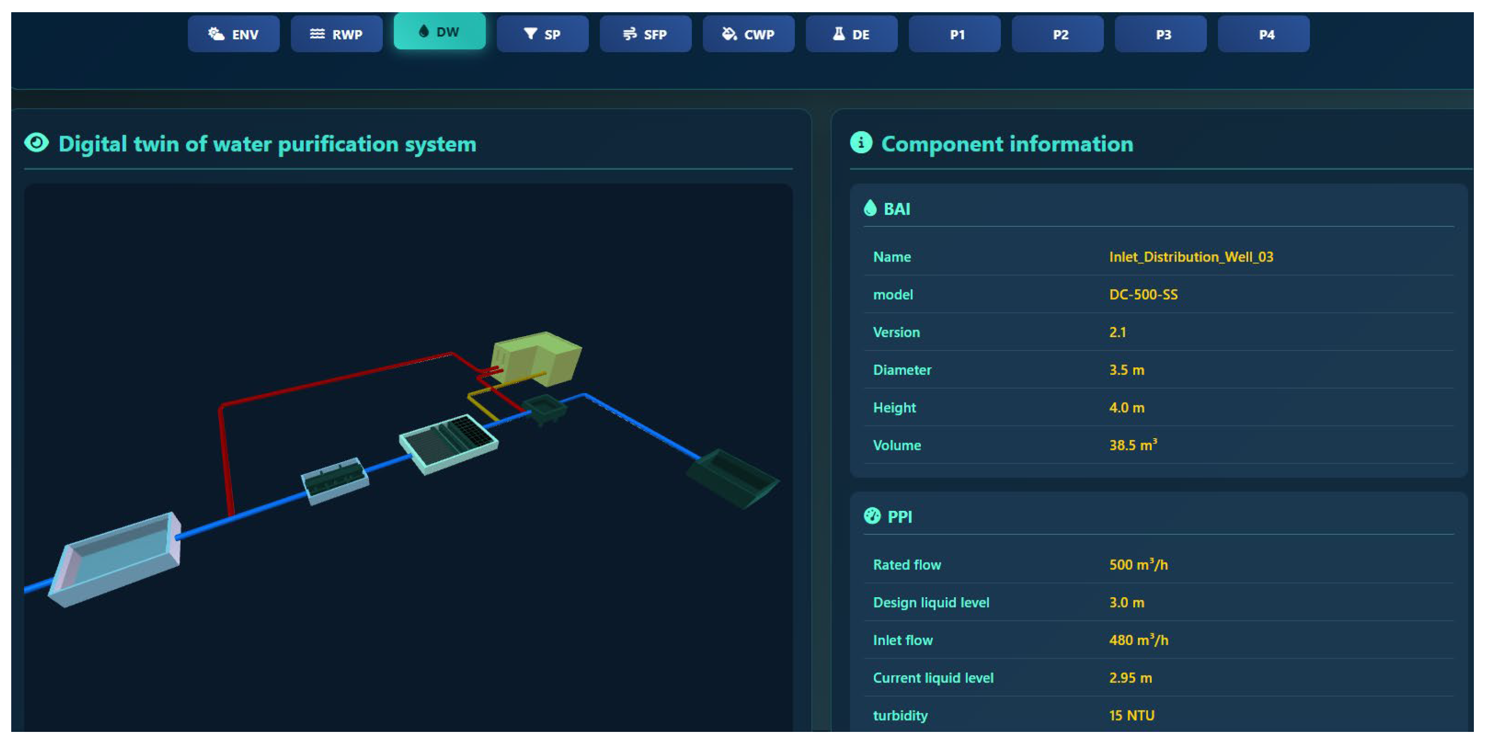 Figure 10, with a functional menu area at the top of the page supporting the switching and viewing of different components. The left side of the interface is the 3D visualization area for the digital twin, displaying, from left to right, a clear water tank, a siphon filter, a sedimentation tank, a water distribution chamber, a chemical dosing device, and a rainwater collection tank. Blue pipelines represent the water flow lines, yellow pipelines represent the chemical dosing lines, and red pipelines represent the sewage return lines. The right side of the interface is a component information display area, which can present the corresponding dataset information for each component.