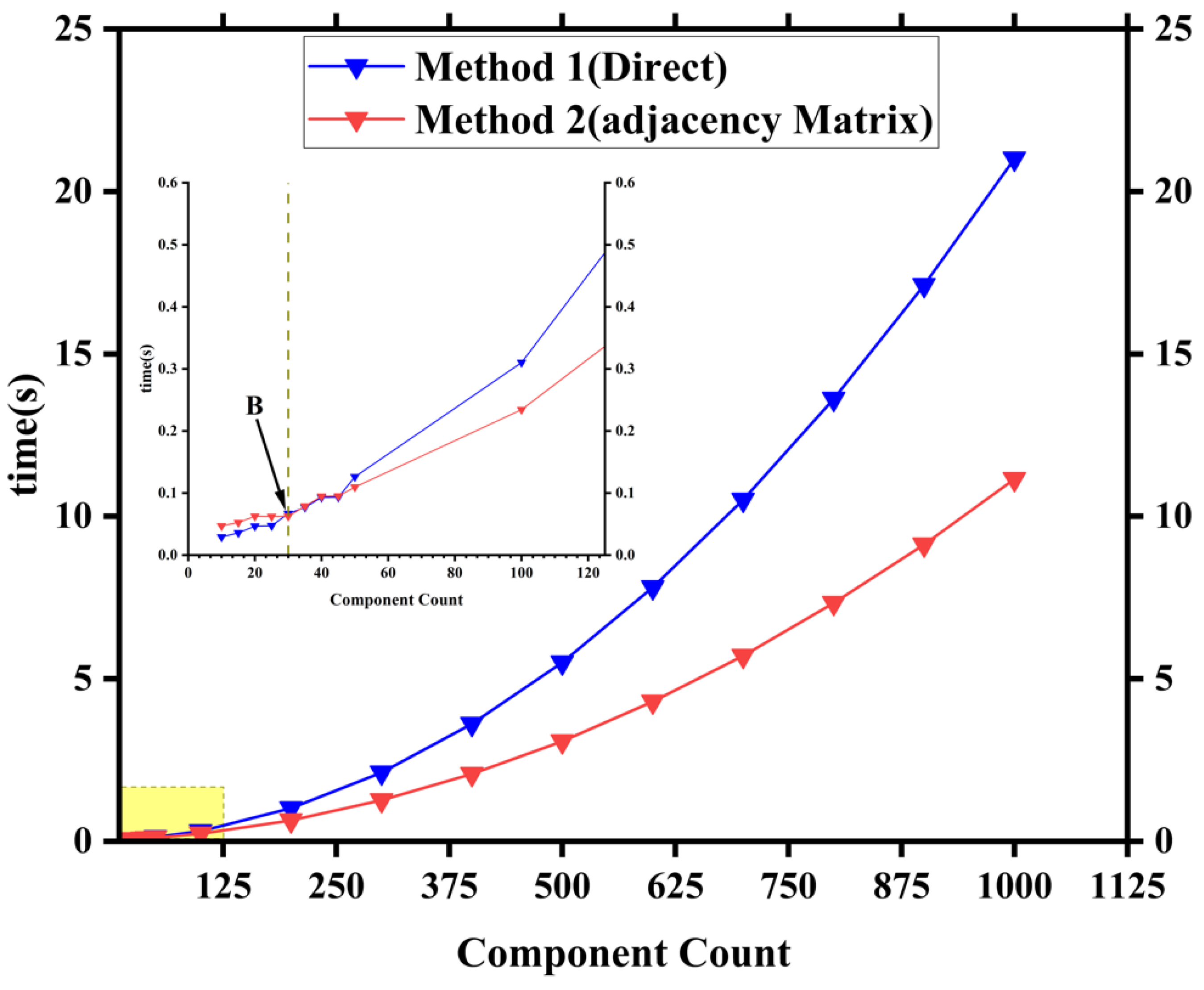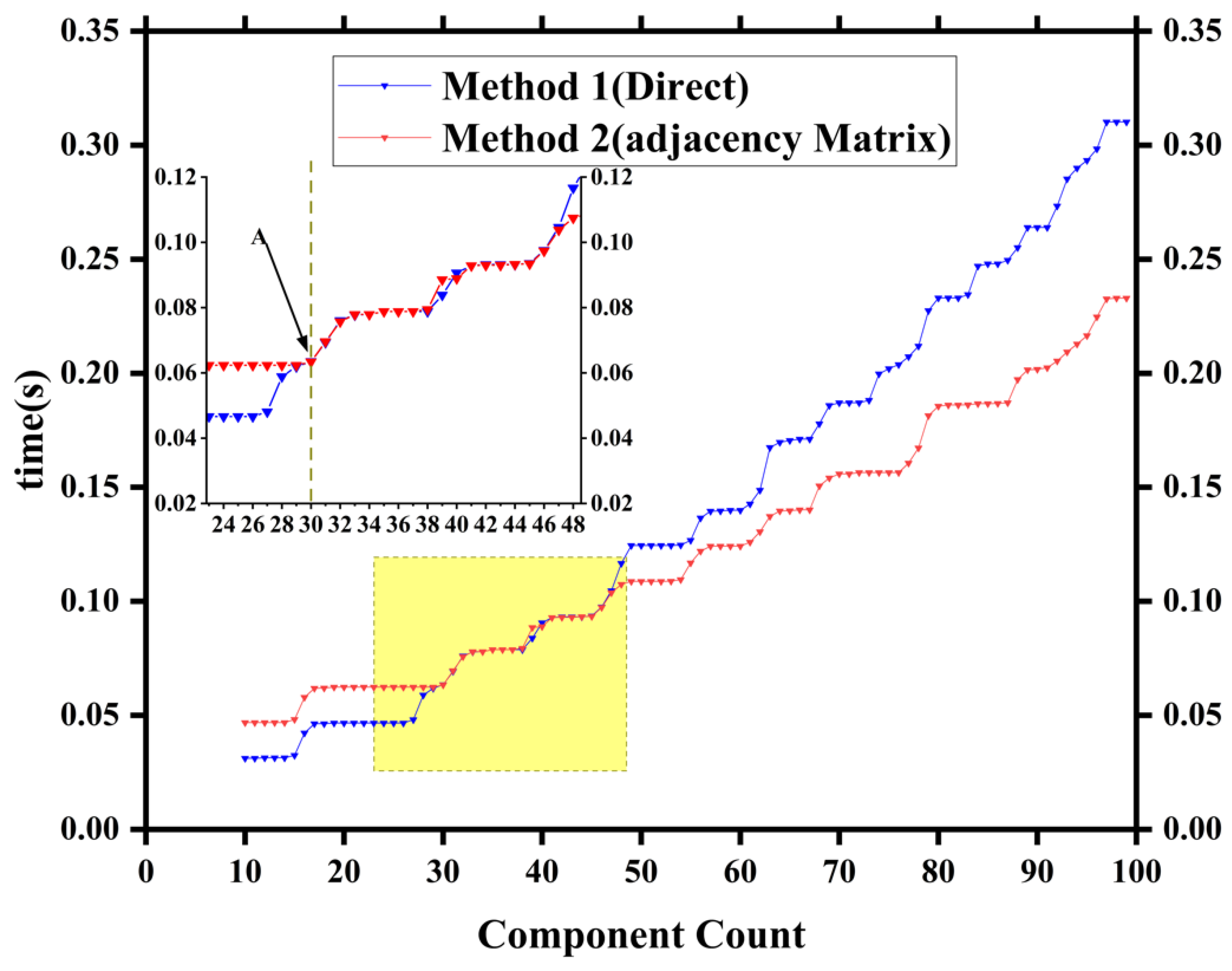 Figure 13). Beyond 47 components, the adjacency matrix-based method surpassed the direct traversal method in efficiency, averaging 18.61% faster. As the component scale continued to expand beyond 300 (