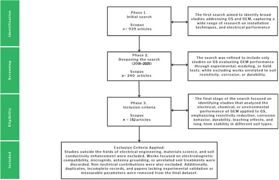 To refine the scope of this systematic review, a series of exclusion filters were applied to ensure that only studies directly related to GEM in earthing and lightning protection systems were analyzed. Non-relevant topics such as electromagnetic compatibility, antenna grounding, microgrids, and unrelated soil treatments were excluded. Additionally, non-technical publications, patents without experimental validation, editorials, and duplicates were removed. These criteria ensured that the resulting dataset represented robust and reproducible evidence concerning the electrical, chemical, and environmental behavior of GEM in practical applications.