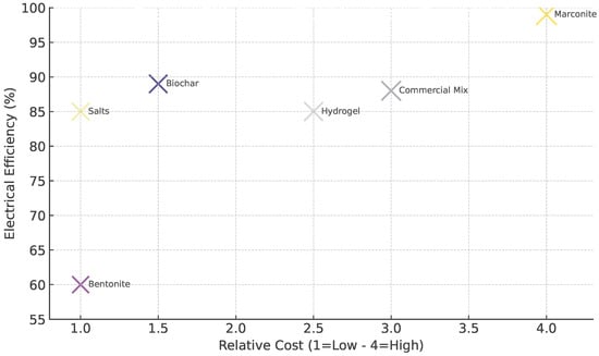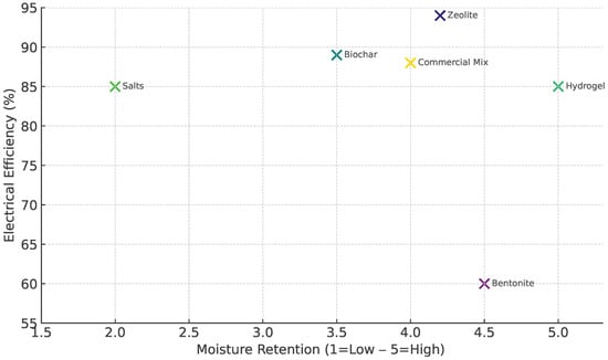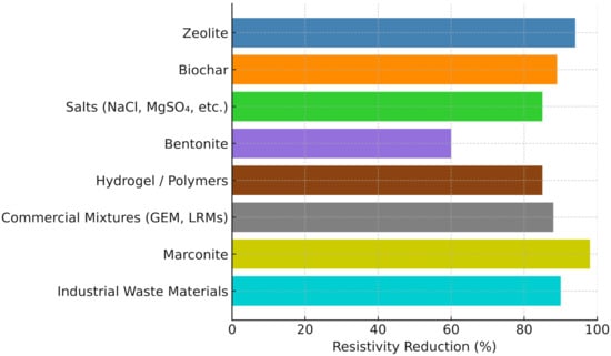 The analysis revealed that the performance of GEM depends on multiple interrelated factors, both environmental and material-based. Soil composition (clay, sand, calcareous, loam) determines the ionic exchange and moisture retention capacity, directly influencing the soil resistivity () and the efficiency of the installed grounding electrodes. High-resistivity soils require materials capable of maintaining stable conductivity, even under low humidity; consequently, compounds such as bentonite, graphite, and carbonaceous composites are frequently used due to their hygroscopic and conductive properties.