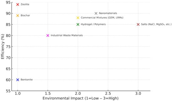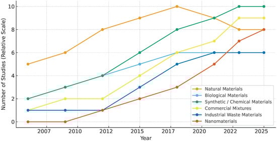 Subgroup analyses were conducted by GEM category (mineral, carbonaceous, polymeric, hybrid, or nanomaterial) to identify performance patterns and sources of variability. These steps ensured a methodologically robust and reproducible synthesis process.