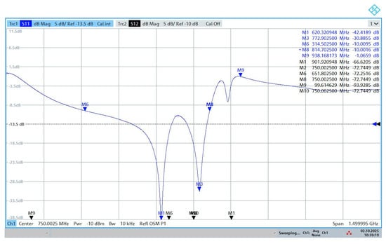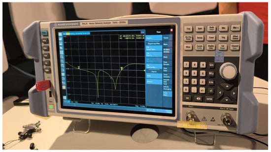 In practice, such low capacitance values are difficult to implement when using standard discrete capacitors. Therefore, a practical approximation was attempted by connecting two capacitors of 2.2 pF in series, resulting in an equivalent capacitance of approximately 1.1 pF, which is close to the theoretical value. This capacitor network was connected in parallel with a 50 Ω resistor in order to emulate the measurement and matching conditions. However, as shown in Figure 3, the experimental results did not fully match the expected theoretical predictions. The discrepancies can be attributed to component tolerances, parasitic effects (such as pad capacitance and equivalent series inductance), and the damping introduced by the parallel resistance, which significantly affects the quality factor and the resonance depth. To improve the tuning accuracy, further optimization is required, either by employing high-Q capacitors with smaller nominal values, trimmer capacitors for fine adjustment, or by designing an appropriate impedance matching network based on the measured input impedance of the antenna. Also, connecting three 4.7 pF capacitors connected in series and then in parallel with the resistor of 50 Ω was considered, and the results are better, as can be seen in Figure 4. The values for the capacitors were considered from the ones present on the market, with small values like 2.2 pF, 3.3 pF, and 4.7 pF. The equivalent capacitance of three such capacitors in series is 0.9 pF, 1.1 pF, and 1.56 pF. Connecting three 4.7 pF capacitors in series led to better performances in practice due to the fact that when talking about the physical structure, we must also consider the parasitic effects from the structure, the capacitor tolerances, and the losses.