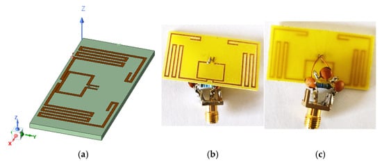 RFID antenna analyzed: (a) modeled antenna; (b) practical antenna front view; (c) practical antenna back view.