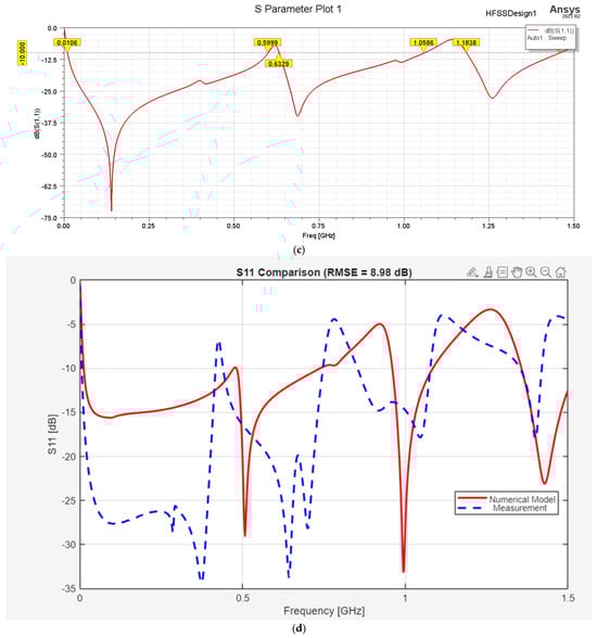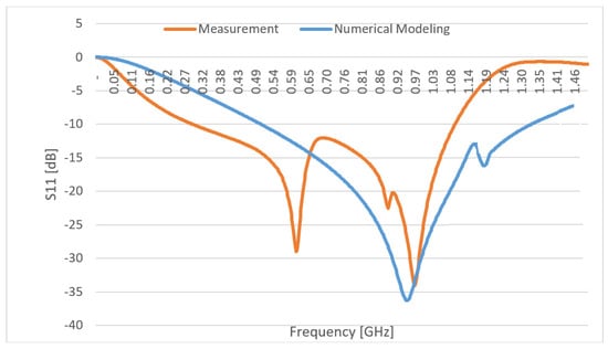 For a better understanding of the differences between the practical and modeled antenna S-parameters, the graph in Figure 6 can be observed. The comparison between numerical modeling and measurement reveals noticeable discrepancies in the S11 response of the proposed antenna. These deviations are primarily attributed to practical implementation factors that are not fully captured in the idealized simulation model. The tuning network employs capacitors with values below 2 pF, which are highly sensitive to manufacturing tolerances, which can also be a cause. Even small deviations lead to significant frequency shifts at UHF. In addition, parasitics, such as equivalent series inductance (ESL) and resistance (ESR) of the capacitors, as well as stray capacitances that are introduced by PCB pads, solder joints, and interconnecting wires, contribute to the mismatch.