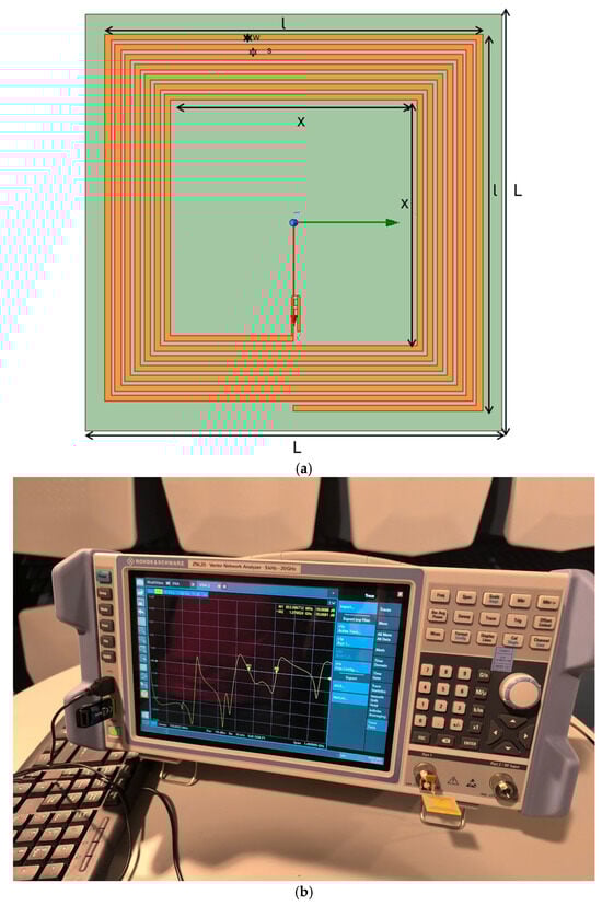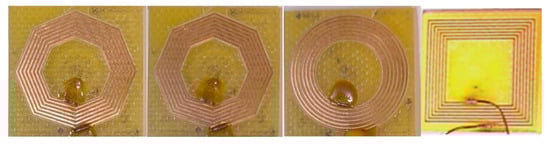 The values of the capacitance necessary were calculated for the four structures considered with Formula (1). The structures were considered to have an exterior diameter between 17 and 20 mm. It can be observed that the capacitance necessary for the inductors to resonate in the bandwidth considered is very low, and it is very difficult to obtain it in practice (Table 3). In this table, De represents the exterior diameter of the structure and is measured in mm, N represents the number of turns, w represents the width of one turn in mm, and s represents the spacing between two consecutive turns. The four columns, C circular, C square, C hexagonal, and C octagonal, represent the capacitances obtained for the four shapes of spiral antennas considered in pF. This is why, in this case, the coils were considered to be tested with only a 50 Ω resistance in parallel with the planar structure. There are some variations considering the tested structures and the results from the numerical modeling, but it is understandable. However, analyzing the results, one can tell that in both cases the structure functions in more than one bandwidth, and the considered bandwidth is one of them. The spiral inductors analyzed can be seen in Figure 8, and they are the same as the ones in [31]. The rectangular structure constructed through numerical modeling is presented in Figure 9a. The experimental results obtained for the rectangular antenna are presented in Figure 9b, while the corresponding results derived from numerical modeling are shown in Figure 9c. Figure 9d presents the results for a comparison and the RMSE error.