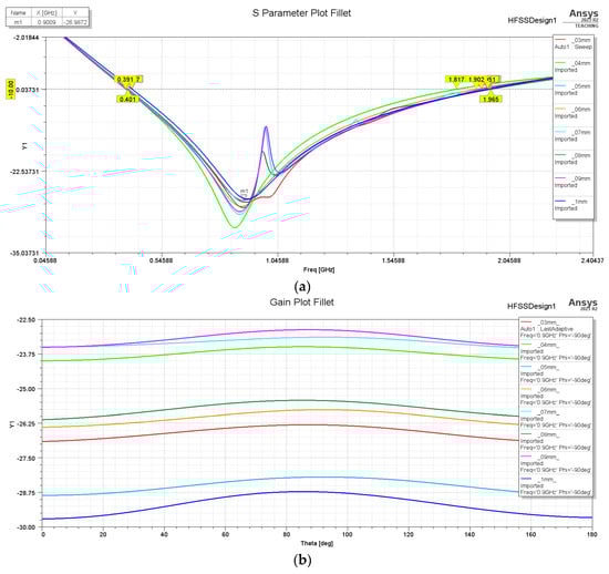 To optimize the previously designed high-frequency antenna, the geometry of the model was adjusted by applying rounding and chamfering to the edge corners (Figure 14), with fillet radius values ranging from 0.3 to 1 mm. The structures with rounded corners are presented in Figure 15. Analyzing the S-parameters (Figure 16a), it is concluded that the size of the fillet radius applied to the outer corners directly influences the antenna’s matching performance. The gain (Figure 16b) varies noticeably with the fillet radius, with values increasing as the radius grows. The highest gain is obtained for the 0.9 mm radius.