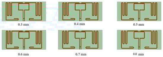 Four structures were modeled to determine the influence of the distance between the central square and the meandered segments, and they can be seen in Figure 19. The graph from Figure 20 shows the influence of the distance between the central square and the meandered segments on the antenna matching. As the distance decreases (from 15.9 mm to 11.9 mm), the resonance frequency changes slightly. The best matching is obtained for the 11.9 mm distance (orange curve), which exhibits a clear minimum around 0.9 GHz and is also the only smooth curve, without disturbances or multiple resonances. This indicates stable and optimal operation for this configuration.