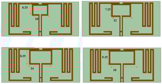 Four cases were selected for analysis, in which the dimensions of the central square of the radiating element were modified in order to determine how this parameter influences the antenna’s performance (Figure 22).