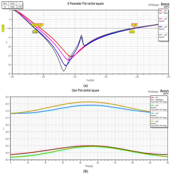 Variation in the S-parameter and gain based on the central square dimensions: (a) S-parameters; (b) gain.