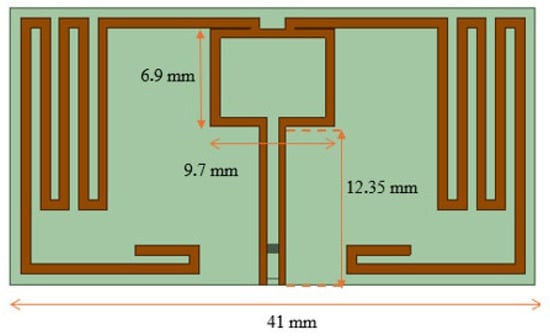 The first structure considered has a simple design and was made in a modified T-match configuration, which was connected at both ends by a meandering line. The T-match ensures proper impedance matching and has a compact antenna design, but it is larger than other antennas operating in the same frequency range. To achieve a conjugate match between the tag chip and the proposed antenna, a π-shaped structure was applied. The folded dipole, which modifies the electrical length, was directly coupled to the π structure, resulting in a reduction in the physical size of the antenna, and consisted of a dipole with a width of 0.75 mm, bent into a serpentine shape. The material used as a conductor was copper. The radiating element of the tag was printed on a thin substrate, FR4, with a thickness of 1.5 mm and a total area of 48 × 2.63 × 1.51 mm3. This dielectric was chosen due to its versatility and also because it is accessible and has a low cost. The descriptive geometry of the antenna with its dimensions and geometrical shape is detailed in Figure 1. In Table 2, the dimensions of the structure can be seen.