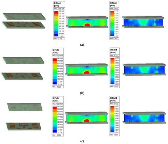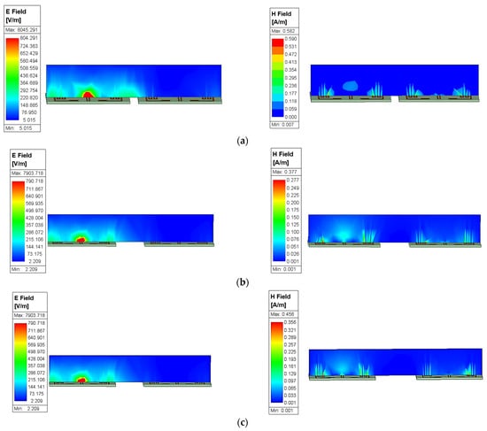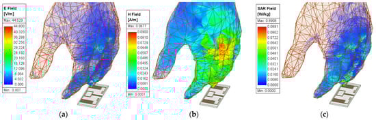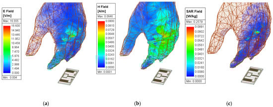 The parameters of interest for a distance of 10 mm between the antenna and hand: (a) electric field intensity; (b) magnetic field intensity; (c) SAR.
