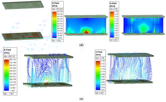 The simulation results indicate that as the distance between the arm and the RFID antenna increases, the values of the electric field, magnetic field, and SAR decrease significantly. In all four analyzed cases, including the closest configuration, the obtained values remain below the limits established by ICNIRP standards, indicating a safe level of exposure. Therefore, it can be concluded that the antenna can be safely used in body-proximate applications, particularly when a minimum separation distance of a few millimeters is maintained. For observation, the values obtained for a distance of 10 mm (Figure 29) and 40 mm (Figure 30) are presented. For the first case, the obtained values for the electric field (44.5 V/m), magnetic field (0.0817 A/m), and SAR (0.890 W/kg) are all below the limits established by the ICNIRP guidelines, indicating that the structure complies with safety regulations for frequencies below 2 GHz.