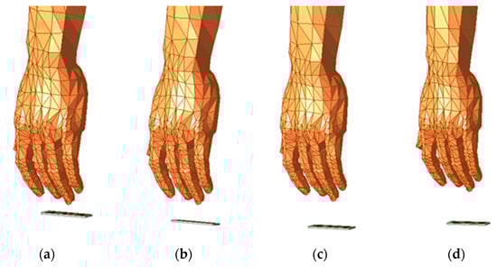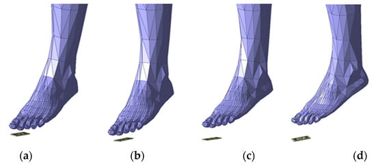 To examine how the electromagnetic fields interact with the foot, four simulation cases were performed in which the foot model was positioned at the same distance from the antenna as the arm in the previous case. The models considered are presented in Figure 31.