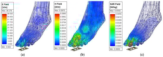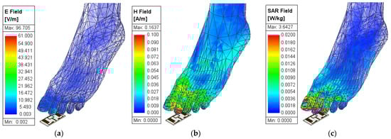 The parameters of interest for a distance of 10 mm between the antenna and leg: (a) electric field intensity; (b) magnetic field intensity; (c) SAR.