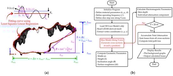 The computational implementation of this analytical workflow is summarized in Figure 2b. The analytical program processes each cross-section sequentially along the propagation axis, calculates geometric and electromagnetic parameters, and accumulates the attenuation contributions to obtain the total path loss. By integrating LiDAR-derived geometric information, waveguide-based theory, and skin depth analysis, the proposed workflow provides a realistic representation of electromagnetic wave propagation in complex cave environments and forms the foundation for the numerical and experimental validation presented in subsequent sections.